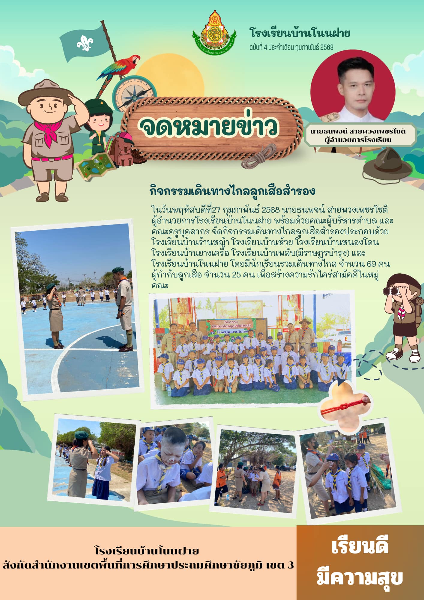 2 | วันพฤหัสบดีที่ 27 กุมพาพันธ์ 2568 โรงเรียนบ้านโนนฝายจัดกิจกรรมเดินทางไกลลูกเสือสำรองชั้นประถมศึกษาปีที่ 1-3 ทั้งนี้มีโรงเรียนในตำบลหนองโดนเข้าร่วมกิจกรรม 5 โรงเรียน