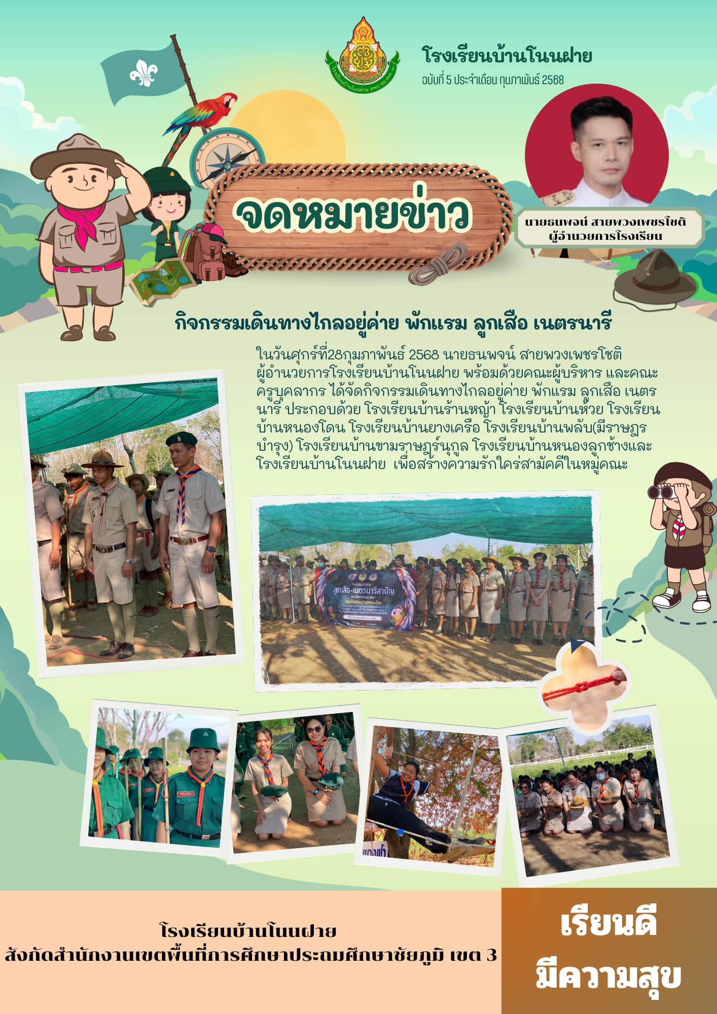 1 | วันศุกร์ที่ 28 กุมภาพันธ์ 2568 โรงเรียนบ้านโนนฝายนำนักเรียนชั้นประถมศึกษาปีที่ 4-6 เข้าร่วมกิจกรรมเดินทางไกลอยู่ค่ายพักแรม ลูกเสือเนตรนารี ณ ค่ายลูกเสือชาวท่าแคมป์
