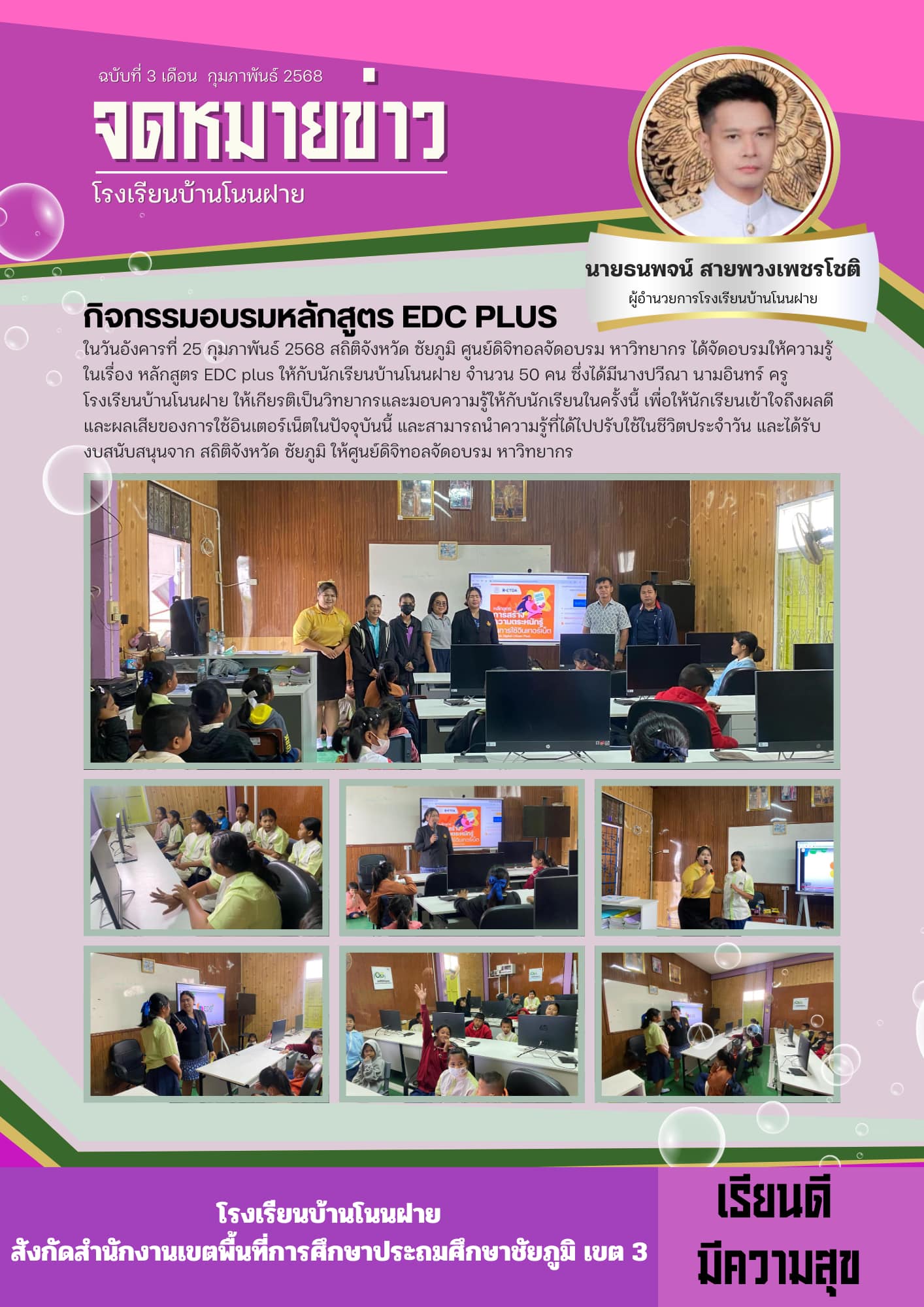 3 | วันอังคารที่ 25 กุมภาพันธ์ 2568โรงเรียนบ้านโนนฝ้ายจัดอบรมให้ความรู้ในเรื่องหลักสูตร edc plus ให้กับนักเรียนโรงเรียนบ้านโนนฝายจำนวน 50 คนทั้งนี้ได้รับงบสนับสนุนจากสถิติจังหวัดชัยภูมิ