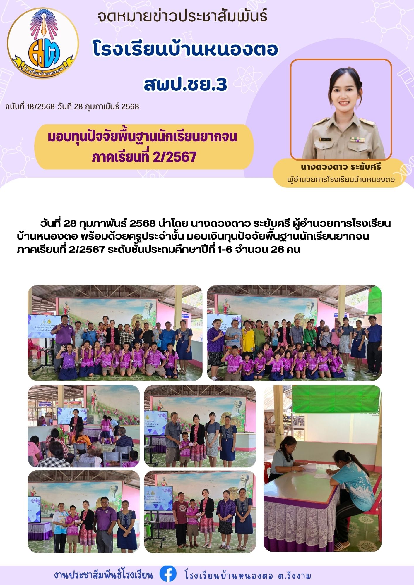 วันที่ 28 กุมภาพันธ์ 2568 นำโดย นางดวงดาว ระยับศรี ผู้อำนวยการโรงเรียนบ้านหนองตอ พร้อมด้วยครูประจำชั้น มอบเงินทุนปัจจัยพื้นฐานนักเรียนยากจน