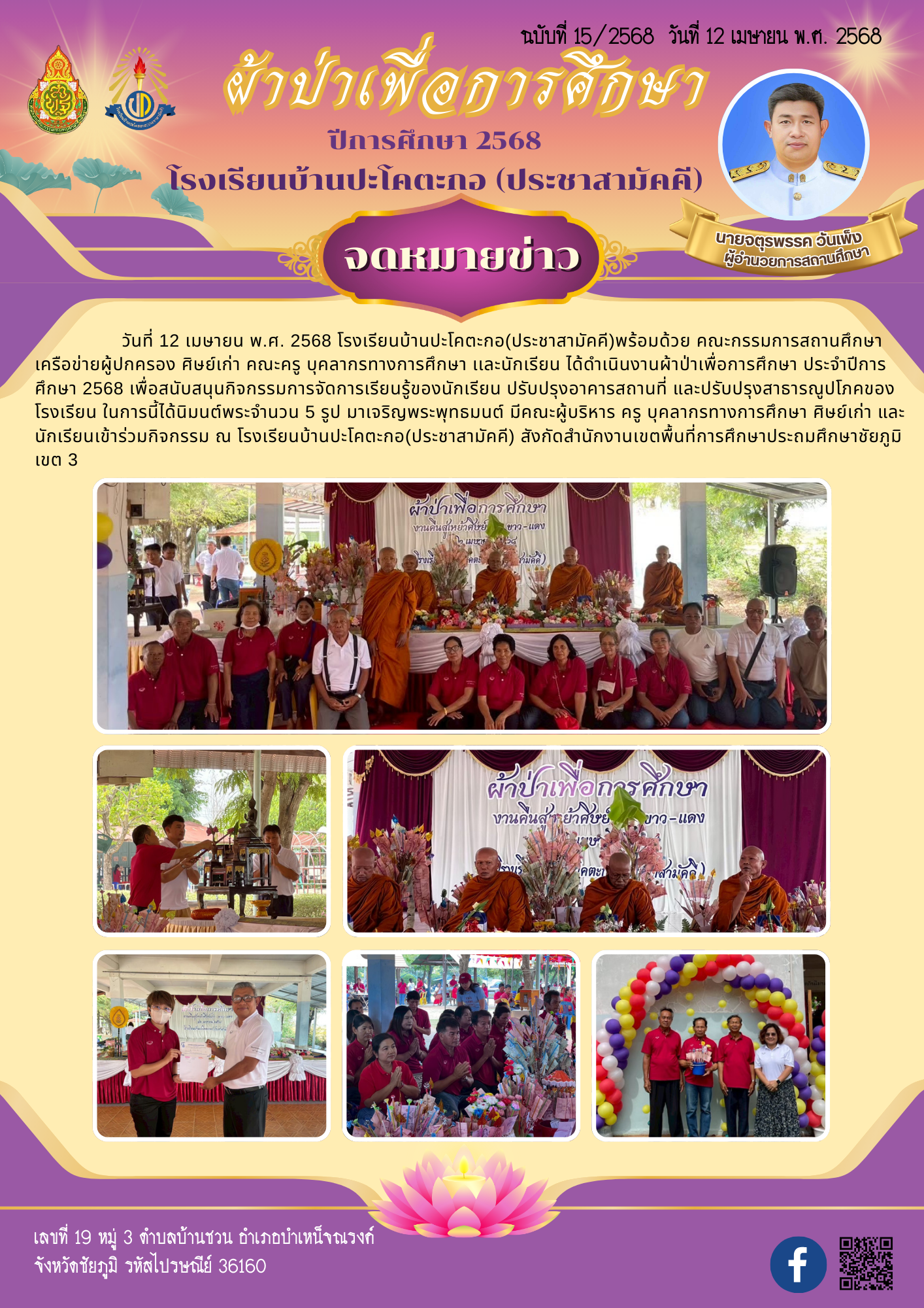 1 | วันที่ 12 เมษายน พ.ศ. 2568 โรงเรียนบ้านปะโคตะกอ(ประชาสามัคคี)พร้อมด้วย คณะกรรมการสถานศึกษา เครือข่ายผู้ปกครอง ศิษย์เก่า คณะครู บุคลากรทางการศึกษา เเละนักเรียน ได้ดำเนินงานผ้าป่าเพื่อการศึกษา ประจำปีการศึกษา 2568 เพื่อสนับสนุนกิจกรรมการจัดการเรียนรู้ของนักเรียน ปรับปรุงอาคารสถานที่ และปรับปรุงสาธารณูปโภคของโรงเรียน ในการนี้ได้นิมนต์พระจำนวน 5 รูป มาเจริญพระพุทธมนต์ มีคณะผู้บริหาร ครู บุคลากรทางการศึกษา ศิษย์เก่า และนักเรียนเข้าร่วมกิจกรรม ณ โรงเรียนบ้านปะโคตะกอ(ประชาสามัคคี) สังกัดสำนักงานเขตพื้นที่การศึกษาประถมศึกษาชัยภูมิ เขต 3
