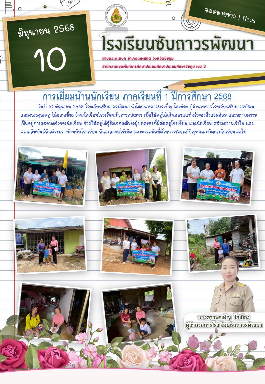 8 | วันที่ 10 มิถุนายน 2568 โรงเรียนซับถาวรพัฒนา นำโดยนางสาวพรเพ็ญ โสเมือง ผู้อำนวยการโรงเรียนซับถาวรพัฒนา และคณะคุณครู ได้ออกเยี่ยมบ้านนักเรียนโรงเรียนซับถาวรพัฒนา เพื่อให้ครูได้เห็นสภาพแท้จริงของสิ่งแวดล้อม และสภาพความเป็นอยู่ทางครอบครัวของนักเรียน ช่วยให้ครูได้รู้ถึงเจตคติของผู้ปกครองที่มีต่อครูโรงเรียน และนักเรียน สร้างความเข้าใจ และความสัมพันธ์อันดีระหว่างบ้านกับโรงเรียน อันจะส่งผลให้เกิด ความร่วมมือที่ดีในการช่วยแก้ปัญหาและพัฒนานักเรียนต่อไป