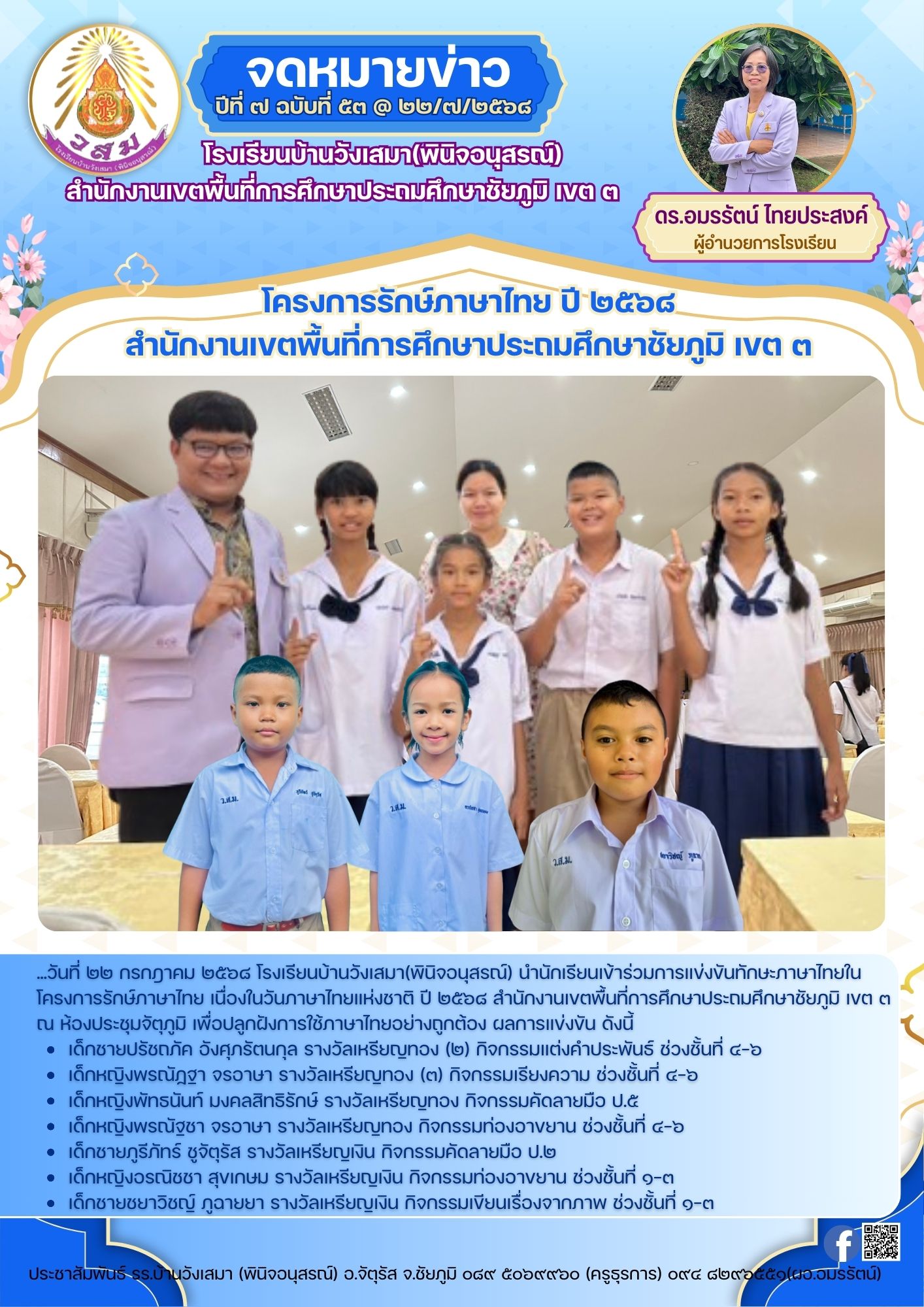 7 | ...วันที่ ๒๒ กรกฎาคม ๒๕๖๘ โรงเรียนบ้านวังเสมา(พินิจอนุสรณ์) นำนักเรียนเข้าร่วมการแข่งขันทักษะภาษาไทยในโครงการรักษ์ภาษาไทย เนื่องในวันภาษาไทยแห่งชาติ ปี ๒๕๖๘ สำนักงานเขตพื้นที่การศึกษาประถมศึกษาชัยภูมิ เขต ๓ ณ ห้องประชุมจัตุภูมิ เพื่อปลูกฝังการใช้ภาษาไทยอย่างถูกต้อง ผลการแข่งขัน ดังนี้