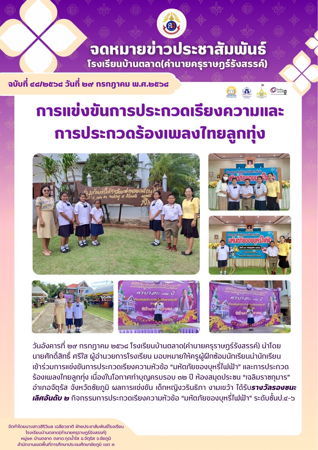 8 | วันอังคารที่ ๒๙ กรกฎาคม ๒๕๖๘ โรงเรียนบ้านตลาด(คำนายครุราษฎร์รังสรรค์) นำโดยนายศักดิ์สิทธิ์ ศรีใส ผู้อำนวยการโรงเรียน มอบหมายให้ครูผู้ฝึกซ้อมนักเรียนนำนักเรียนเข้าร่วมการแข่งขันการประกวดเรียงความหัวข้อ "มหัตภัยของบุหรี่ไฟฟ้า" และการประกวดร้องเพลงไทยลูกทุ่ง เนื่องในโอกาศทำบุญครบรอบ ๓๒ ปี ห้องสมุดประชน "เฉลิมราชกุมาร" อำเภอจัตุรัส จังหวัดชัยภูมิ ผลการแข่งขัน เด็กหญิงวรินธิภา งามเขว้า ได้รับรางวัลรองชนะเลิศอันดับ ๒ กิจกรรมการประกวดเรียงความหัวข้อ "มหัตภัยของบุหรี่ไฟฟ้า" ระดับชั้นป.๔-๖