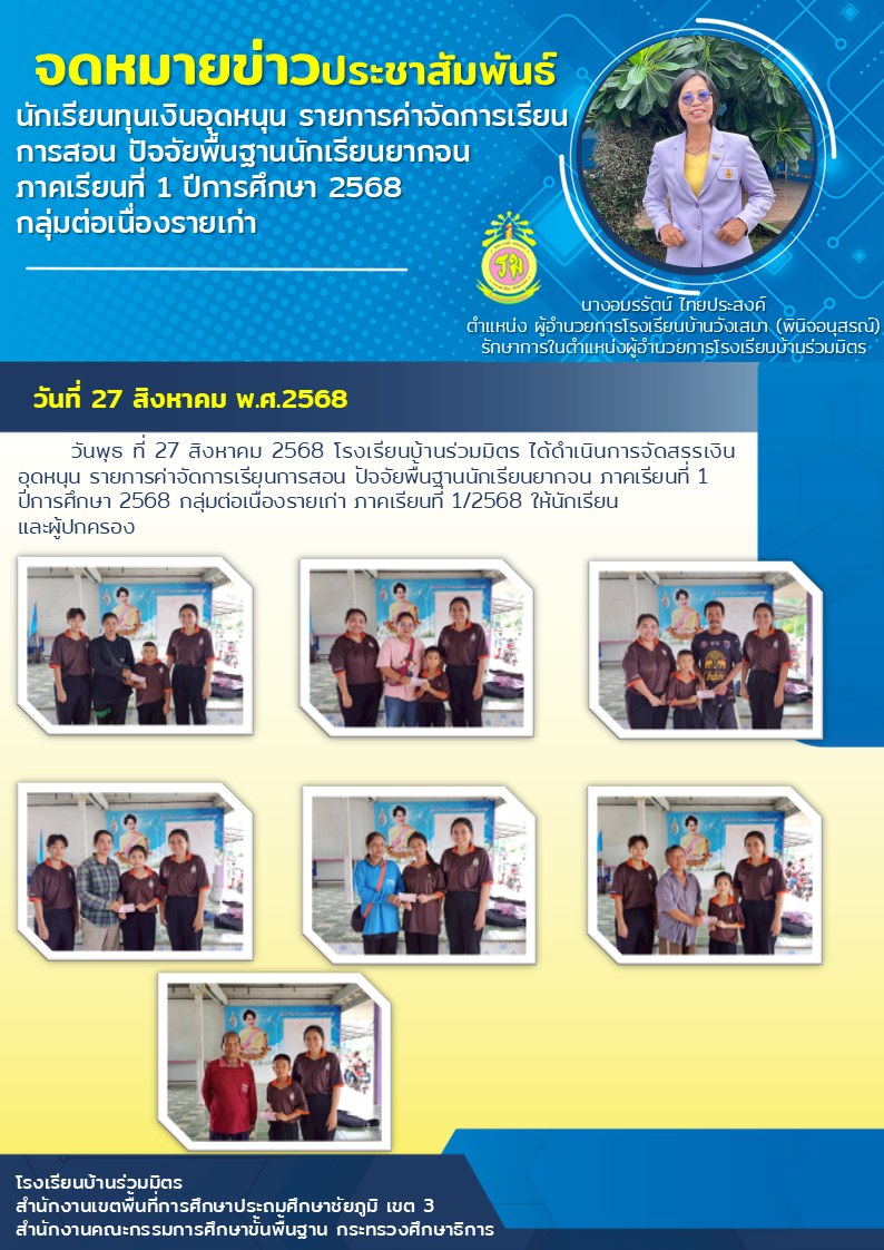 นักเรียนทุนเงินอุดหนุน รายการค่าจัดการเรียนการสอน ปัจจัยพื้นฐานนักเรียนยากจน ภาคเรียนที่ 1 ปีการศึกษา 2568 กลุ่มต่อเนื่องรายเก่า