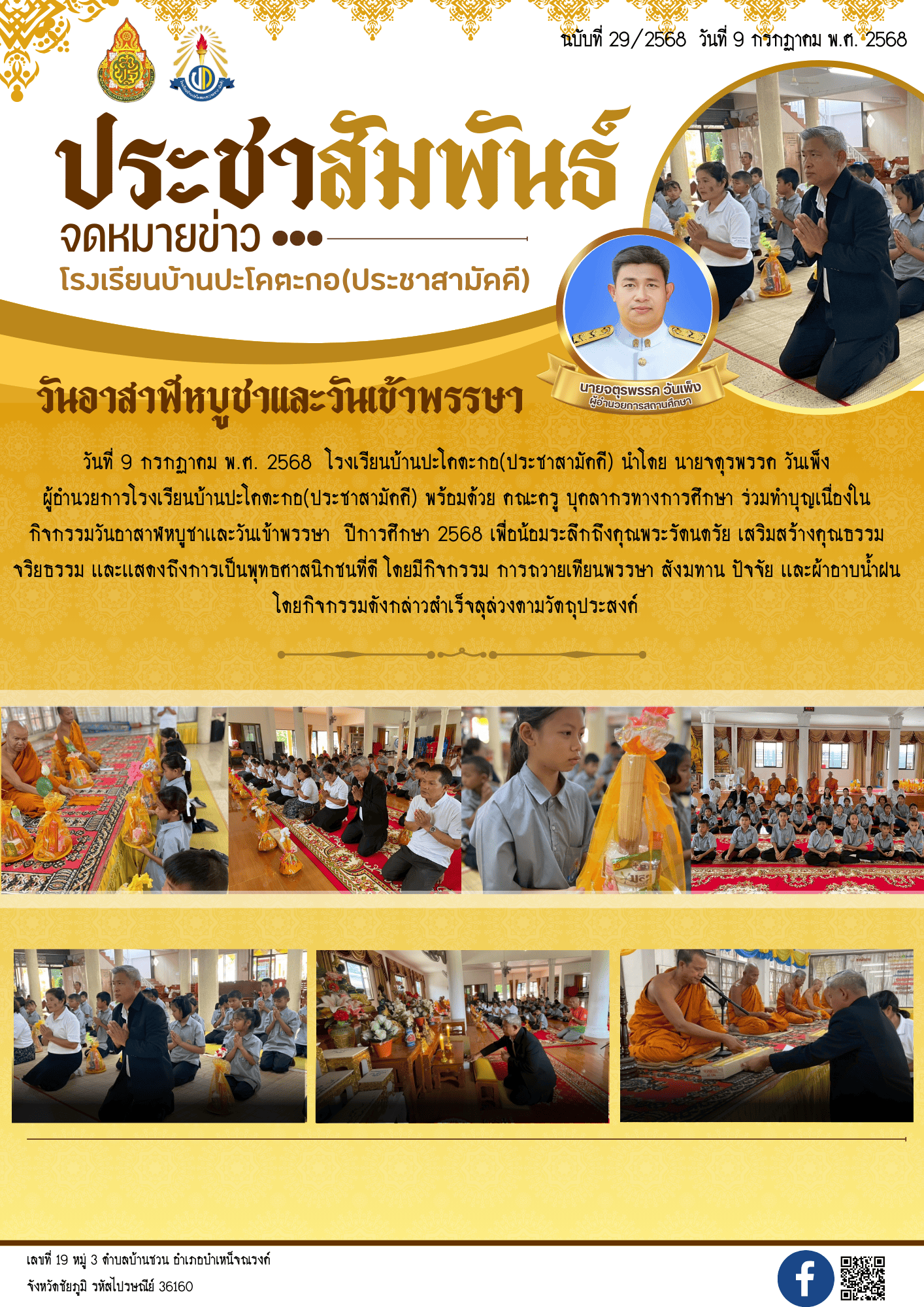 2 | ในวันที่ 9 กรกฏาคม พ.ศ. 2568 โรงเรียนบ้านปะโคตะกอ(ประชาสามัคคี) นำโดย นายจตุรพรรค วันเพ็งผู้อำนวยการโรงเรียน พร้อมด้วย คณะครู บุคลากรทางการศึกษา ร่วมทำบุญเนื่องในกิจกรรมวันอาสาฬหบูชาเเละวันเข้าพรรษา ปีการศึกษา 2568 เพื่อน้อมระลึกถึงคุณพระรัตนตรัย เสริมสร้างคุณธรรม จริยธรรม เเละเเสดงถึงการเป็นพุทธศาสนิกชนที่ดี โดยมีกิจกรรม การถวายเทียนพรรษา สังฆทาน ปัจจัย เเละผ้าอาบน้ำฝน |