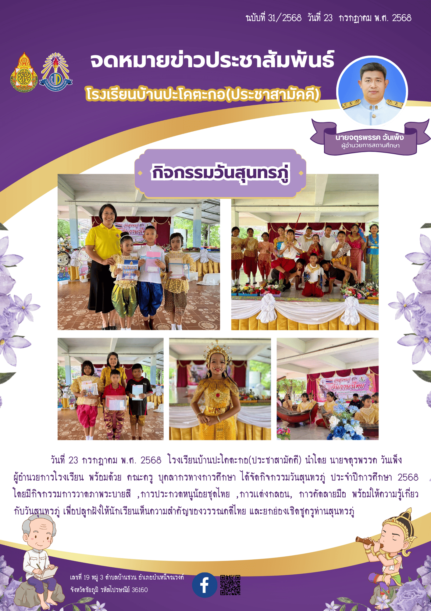 4 | ในวันที่ 23 กรกฎาคม พ.ศ. 2568 โรงเรียนบ้านปะโคตะกอ(ประชาสามัคคี) นำโดย นายจตุรพรรค วันเพ็ง ผู้อำนวยการโรงเรียน พร้อมด้วย คณะครู บุคลากรทางการศึกษา ได้จัดกิจกรรมวันสุนทรภู่ ประจำปีการศึกษา 2568 โดยมีกิจกรรมการวาดภาพระบายสี ,การประกวดหนูน้อยชุดไทย ,การเเต่งกลอน, การคัดลายมือ พร้อมให้ความรู้เกี่ยวกับวันสุนทรภู่ เพื่อปลูกฝังให้นักเรียนเห็นความสำคัญของวรรณคดีไทย และยกย่องเชิดชูครูท่านสุนทรภู่ |