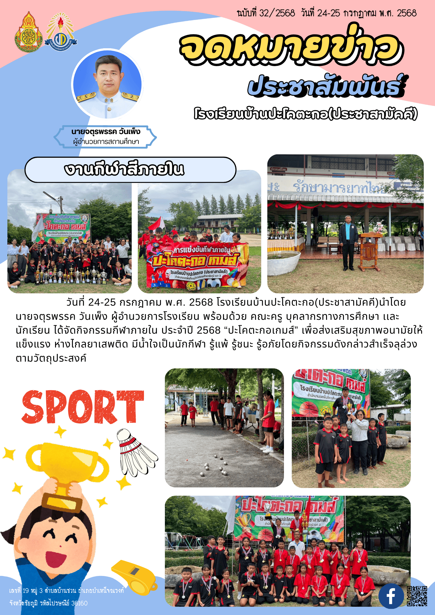 5 | ในวันที่ 24-25 กรกฎาคม พ.ศ. 2568 โรงเรียนบ้านปะโคตะกอ(ประชาสามัคคี)นำโดย นายจตุรพรรค วันเพ็ง ผู้อำนวยการโรงเรียน พร้อมด้วย คณะครู บุคลากรทางการศึกษา เเละนักเรียนได้จัดกิจกรรมกีฬาภายใน ประจำปี 2568 “ปะโคตะกอเกมส์” เพื่อส่งเสริมสุขภาพอนามัยให้แข็งแรง ห่างไกลยาเสพติด มีน้ำใจเป็นนักกีฬา รู้แพ้ รู้ชนะ รู้อภัย |