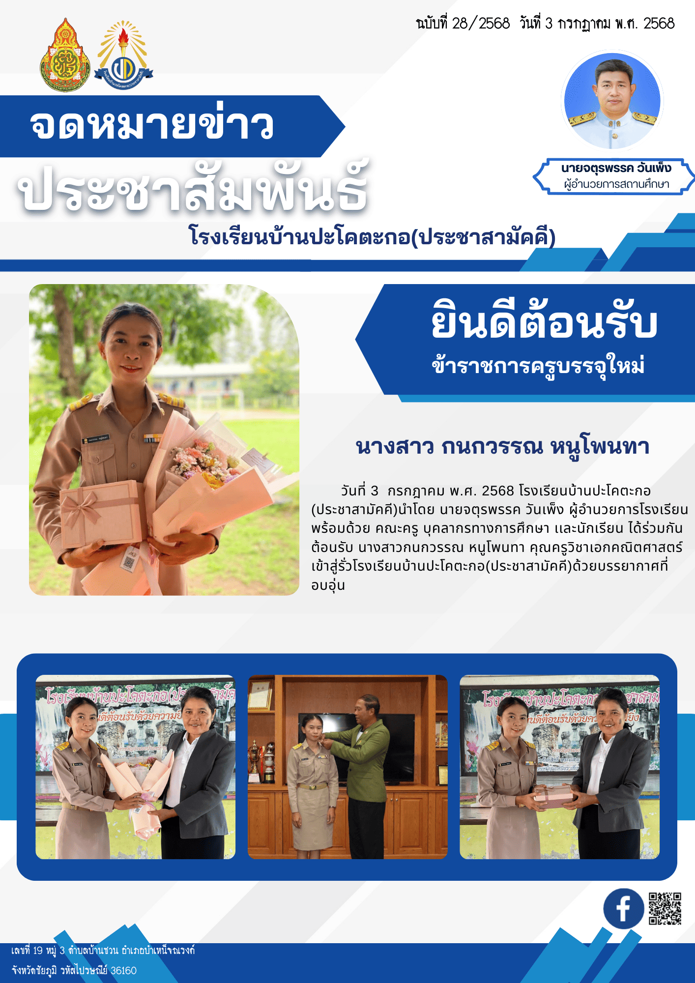 1 | ในวันที่ 3 กรกฎาคม พ.ศ. 2568 โรงเรียนบ้านปะโคตะกอ(ประชาสามัคคี)นำโดย นายจตุรพรรค วันเพ็ง ผู้อำนวยการโรงเรียน พร้อมด้วย คณะครู บุคลากรทางการศึกษา เเละนักเรียน ได้ร่วมกันต้อนรับ นางสาวกนกวรรณ หนูโพนทา คุณครูวิชาเอกคณิตศาสตร์ เข้าสู่รั่วโรงเรียนบ้านปะโคตะกอ(ประชาสามัคคี)ด้วยบรรยากาศที่อบอุ่น |