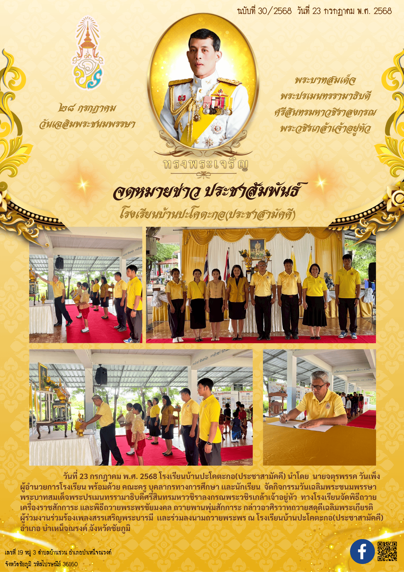 3 | ในวันที่ 23 กรกฎาคม พ.ศ. 2568 โรงเรียนบ้านปะโคตะกอ(ประชาสามัคคี) นำโดย นายจตุรพรรค วันเพ็ง ผู้อำนวยการโรงเรียน พร้อมด้วย คณะครู บุคลากรทางการศึกษา เเละนักเรียน จัดกิจกรรมวันเฉลิมพระชนมพรรษา พระบาทสมเด็จพระปรเมนทรรามาธิบดีศรีสินทรมหาวชิราลงกรณพระวชิรเกล้าเจ้าอยู่หัว ทางโรงเรียนจัดพิธีถวายเครื่องราชสักการะ และพิธีถวายพระพรชัยมงคล ถวายพานพุ่มสักการะ กล่าวอาศิรวาทถวายสดุดีเฉลิมพระเกียรติ ผู้ร่วมงานร่วมร้องเพลงสรรเสริญพระบารมี เเละร่วมลงนามถวายพระพร ณ โรงเรียนบ้านปะโคตะกอ(ประชาสามัคคี) อำเภอ บำเหน็จณรงค์ จังหวัดชัยภูมิ |