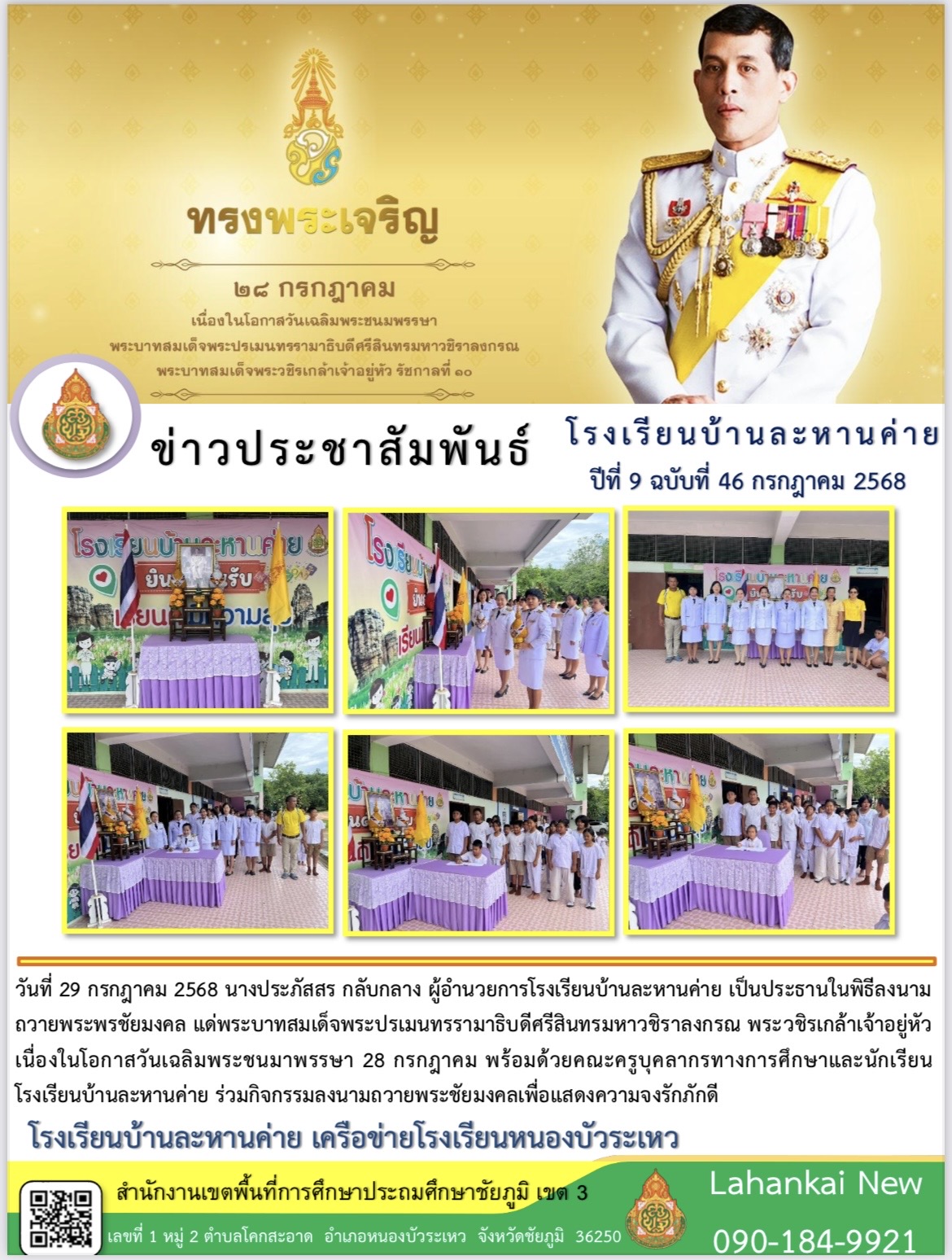 วันที่ 29 กรกฎาคม 2568 นางประภัสสร กลับกลาง ผู้อำนวยการโรงเรียนบ้านละหานค่าย เป็นประธานในพิธีลงนามถวายพระพรชัยมงคล แด่พระบาทสมเด็จพระปรเมนทรรามาธิบดีศรีสินทรมหาวชิราลงกรณ พระวชิรเกล้าเจ้าอยู่หัว เนื่องในโอกาสวันเฉลิมพระชนมาพรรษา 28 กรกฎาคม พร้อมด้วยคณะครูบุคลากรทางการศึกษาและนักเรียนโรงเรียนบ้านละหานค่าย ร่วมกิจกรรมลงนามถวายพระชัยมงคลเพื่อแสดงความจงรักภักดี