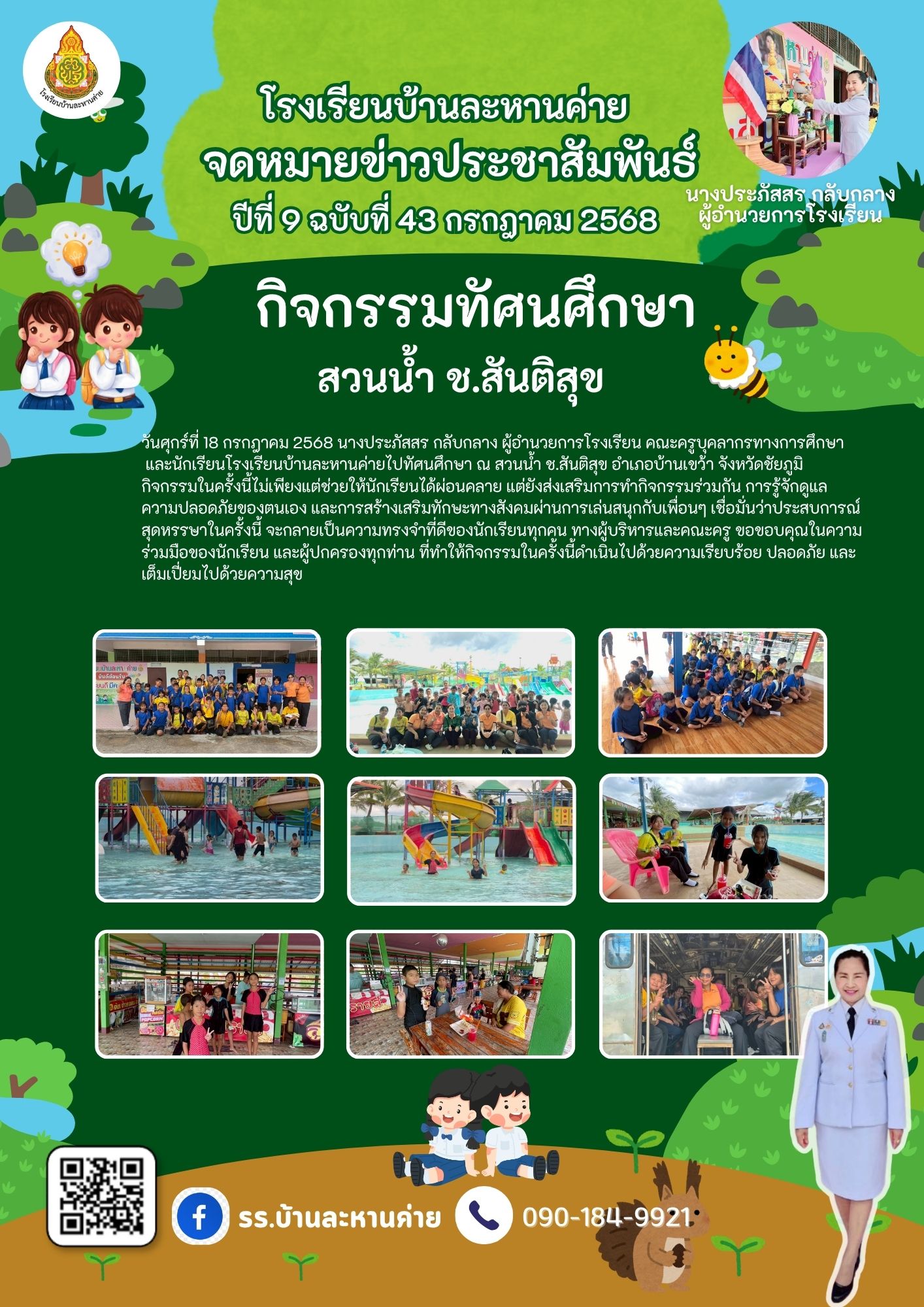 5 | วันศุกร์ที่ 18 กรกฎาคม 2568 นางประภัสสร กลับกลาง ผู้อำนวยการโรงเรียน คณะครูบุคลากรทางการศึกษา และนักเรียนโรงเรียนบ้านละหานค่ายไปทัศนศึกษา ณ สวนน้ำ ช.สันติสุข อำเภอบ้านเขว้า จังหวัดชัยภูมิ กิจกรรมในครั้งนี้ไม่เพียงแต่ช่วยให้นักเรียนได้ผ่อนคลาย แต่ยังส่งเสริมการทำกิจกรรมร่วมกัน การรู้จักดูแล ความปลอดภัยของตนเอง และการสร้างเสริมทักษะทางสังคมผ่านการเล่นสนุกกับเพื่อนๆ เชื่อมั่นว่าประสบการณ์ สุดหรรษาในครั้งนี้ จะกลายเป็นความทรงจำที่ดีของนักเรียนทุกคน ทางผู้บริหารและคณะครู ขอขอบคุณในความร่วมมือของนักเรียน และผู้ปกครองทุกท่าน ที่ทำให้กิจกรรมในครั้งนี้ดำเนินไปด้วยความเรียบร้อย ปลอดภัย และเต็มเปี่ยมไปด้วยความสุข |