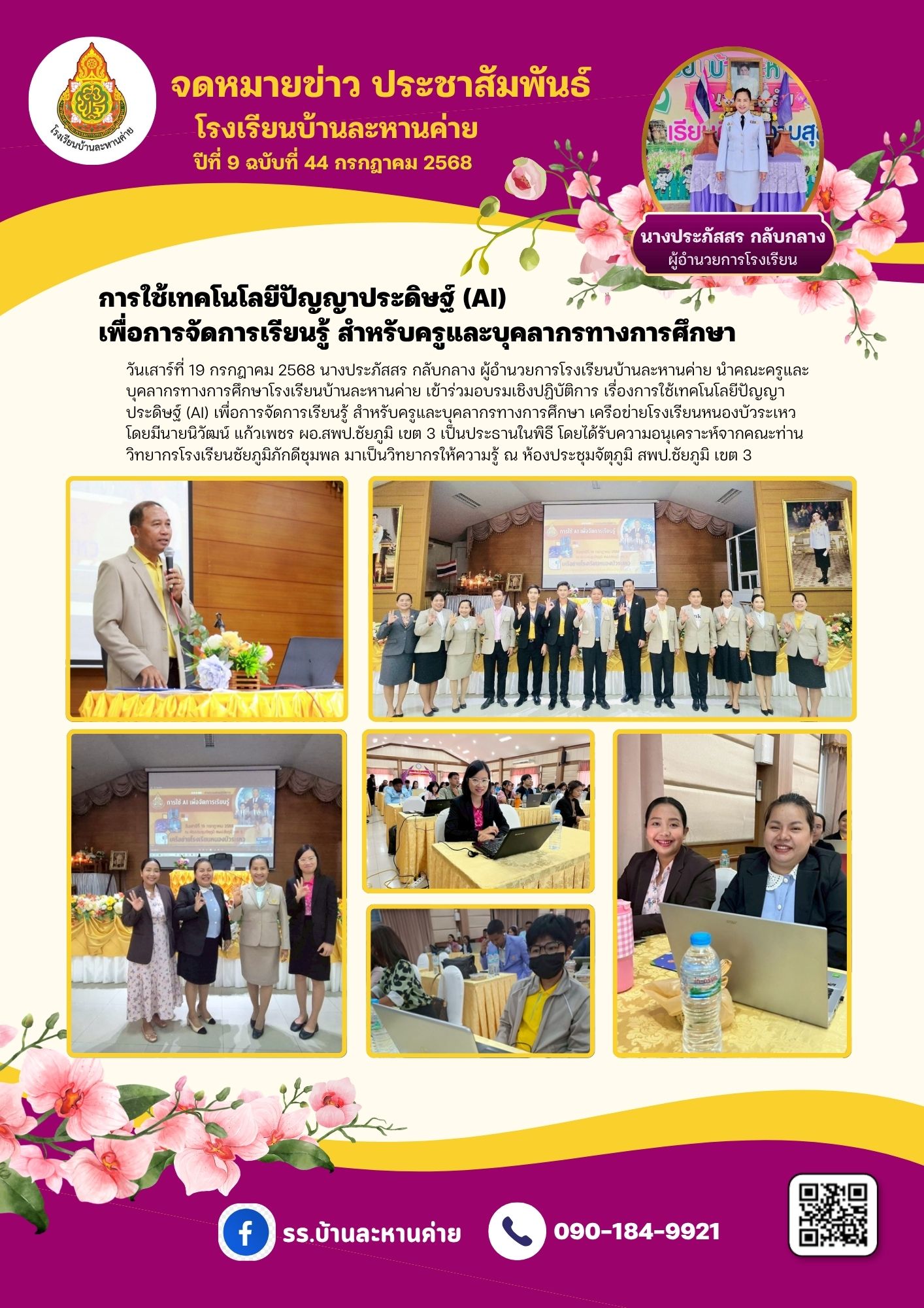 วันเสาร์ที่ 19 กรกฎาคม 2568 นางประภัสสร กลับกลาง ผู้อำนวยการโรงเรียนบ้านละหานค่าย นำคณะครูและ บุคลากรทางการศึกษาโรงเรียนบ้านละหานค่าย เข้าร่วมอบรมเชิงปฏิบัติการ เรื่องการใช้เทคโนโลยีปัญญาประดิษฐ์ (AI) เพื่อการจัดการเรียนรู้ สำหรับครูและบุคลากรทางการศึกษา เครือข่ายโรงเรียนหนองบัวระเหว โดยมีนายนิวัฒน์ แก้วเพชร ผอ.สพป.ชัยภูมิ เขต 3 เป็นประธานในพิธี โดยได้รับความอนุเคราะห์จากคณะท่านวิทยากรโรงเรียนชัยภูมิภักดีชุมพล มาเป็นวิทยากรให้ความรู้ ณ ห้องประชุมจัตุภูมิ สพป.ชัยภูมิ เขต 3