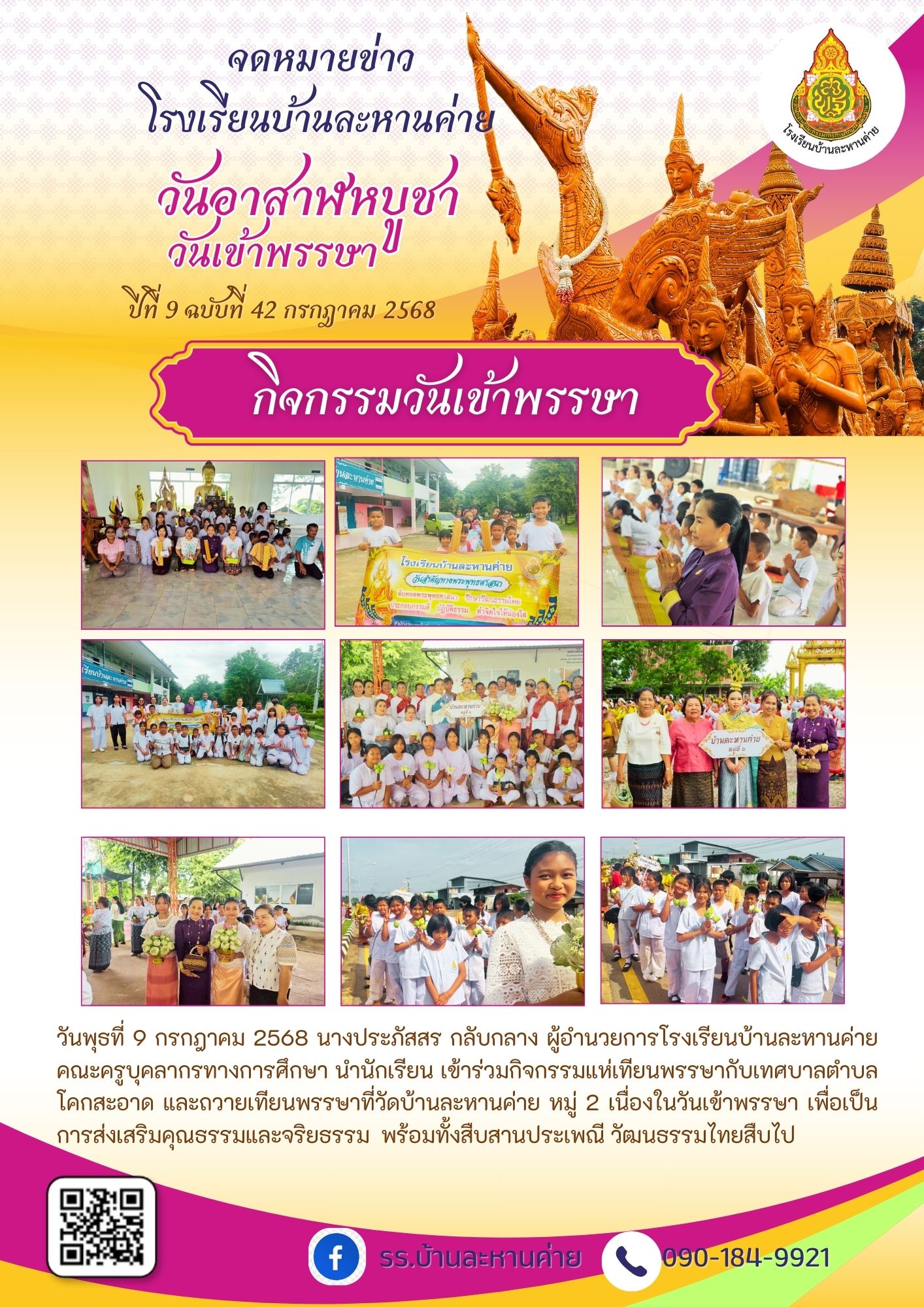 วันพุธที่ 9 กรกฎาคม 2568 นางประภัสสร กลับกลาง ผู้อำนวยการโรงเรียนบ้านละหานค่าย คณะครูบุคลากรทางการศึกษา นำนักเรียน เข้าร่วมกิจกรรมแห่เทียนพรรษากับเทศบาลตำบลโคกสะอาด และถวายเทียนพรรษาที่วัดบ้านละหานค่าย หมู่ 2 เนื่องในวันเข้าพรรษา เพื่อเป็น การส่งเสริมคุณธรรมและจริยธรรม พร้อมทั้งสืบสานประเพณี วัฒนธรรมไทยสืบไป