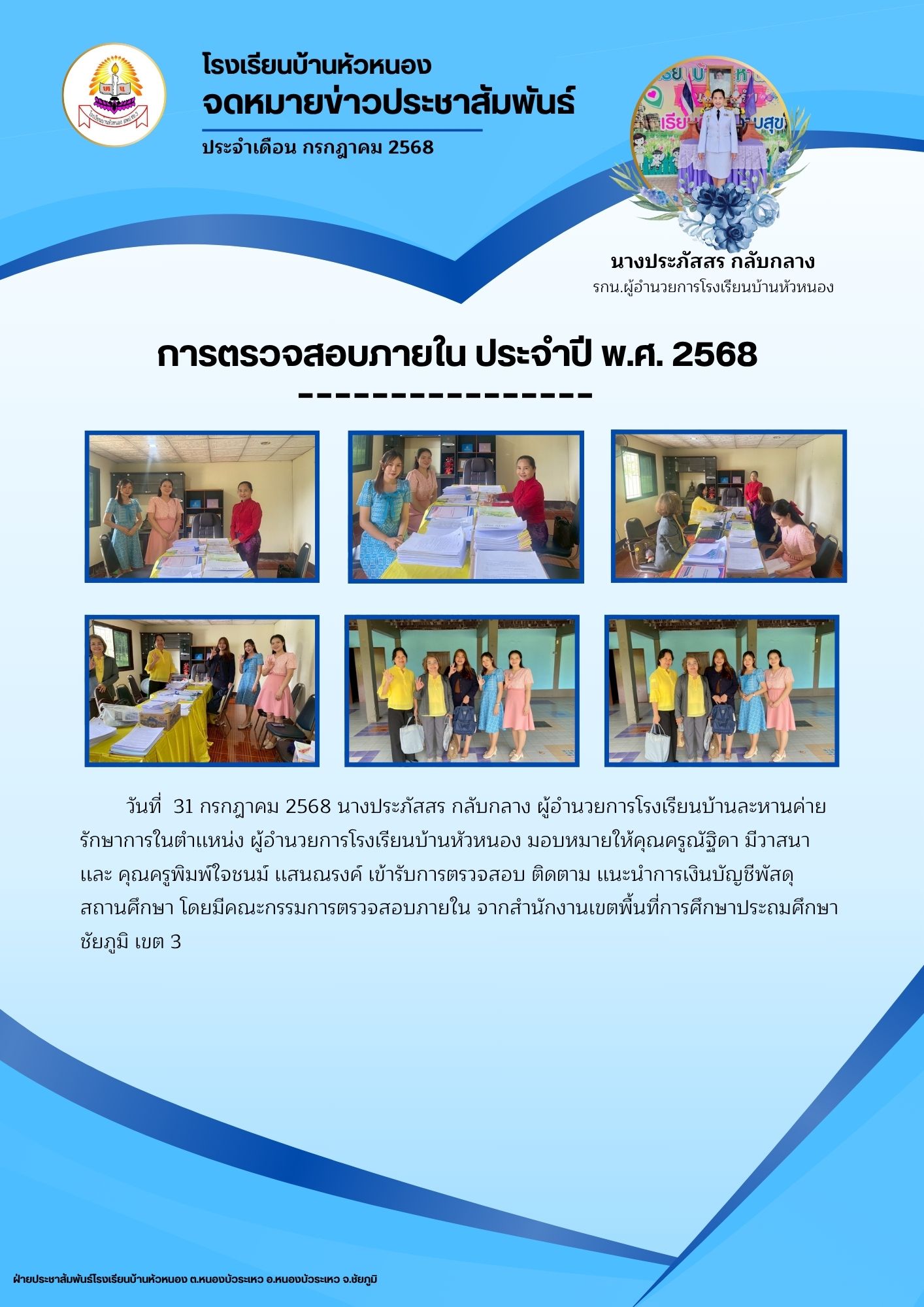 9 | วันที่ 31 กรกฎาคม 2568 นางประภัสสร กลับกลาง รักษาการในตำเเหน่ง ผู้อำนวยการโรงเรียนบ้านหัวหนอง มอบหมายให้คุณครูณัฐิดา มีวาสนา เเละ คุณครูพิมพ์ใจชนม์ เเสนณรงค์ เข้ารับการตรวจสอบ ติดตาม เเนะนำการเงินพัสดุ สถานศึกษา โดยมีคณะกรรมการตรวจสอบภายใน จากสำนักงานเขตพื้นที่การศึกษาประถมศึกษาชัยภูมิ เขต 3