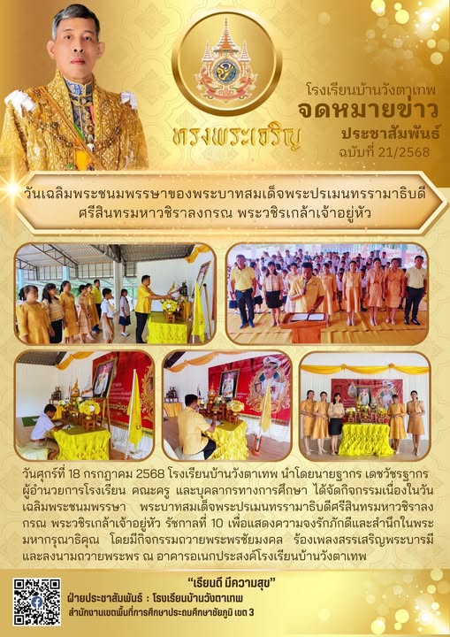 8 | โรงเรียนบ้านวังตาเทพ นำโดยนายฐากร เดชวัชรฐากร ผู้อำนวยการโรงเรียน คณะครู และบุคลากรทางการศึกษา ได้จัดกิจกรรมเนื่องในวันเฉลิมพระชนมพรรษา พระบาทสมเด็จพระปรเมนทรรามาธิบดีศรีสินทรมหาวชิราลงกรณ พระวชิรเกล้าเจ้าอยู่หัว รัชกาลที่ 10