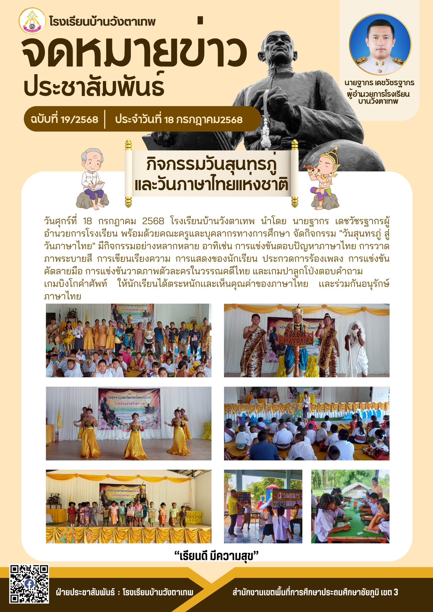 7 | วันศุกร์ที่ 18 กรกฎาคม 2568 โรงเรียนบ้านวังตาเทพ นำโดย นายฐากร เดชวัชรฐากรผู้อำนวยการโรงเรียน พร้อมด้วยคณะครูและบุคลากรทางการศึกษา จัดกิจกรรม "วันสุนทรภู่ สู่วันภาษาไทย" มีกิจกรรมอย่างหลากหลาย