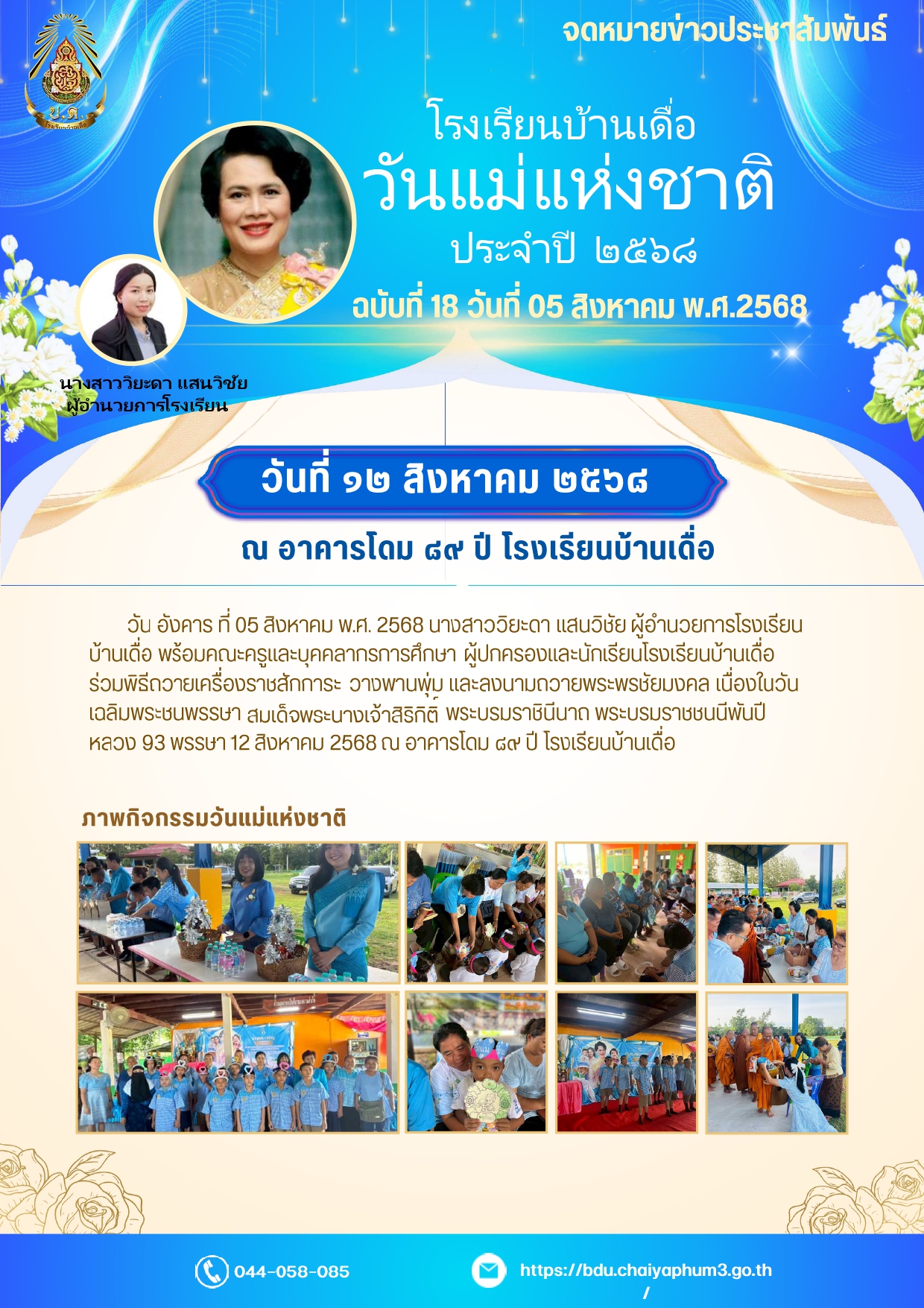 1 | วันอังคารที่ 5 สิงหาคม 2568 นางสาววิยะดา แสนวิชัย ผู้อำนวยการโรงเรียนบ้านเดื่อ พร้อมด้วยคณะครูและบุคลากรทางการศึกษา ผู้ปกครองและนักเรียนโรงเรียนบ้านเดื่อ ร่วมพิธีถวายเครื่องราชสักการะ วางพานพุ่ม และลงนามถวายพระพรชัยมงคล เนื่องในวันเฉลิมพระชนมพรรษา สมเด็จพระนางเจ้าสิริกิติ์ พระบรมราชินีนาถ พระบรมราชชนนีพันปีหลวง 93 พรรษา 12 สิงหาคม 2568 ณ อาคารโดม 89 ปี โรงเรียนบ้านเดื่อ