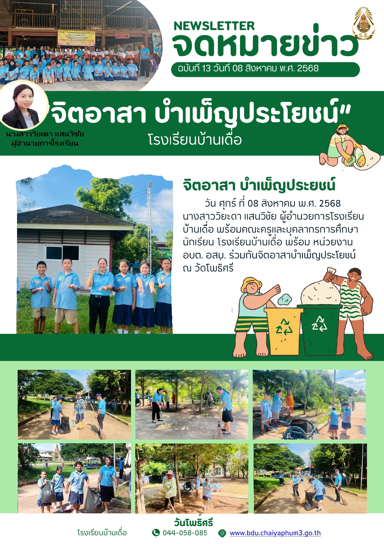 2 | วันศุกร์ที่ 8 สิงหาคม 2568 นางสาววิยะดา แสนวิชัย ผู้อำนวยการโรงเรียนบ้านเดื่อ พร้อมด้วยคณะครูและบุคลากรทางการศึกษา นักเรียน โรงเรียนบ้านเดื่อ พร้อมหน่วยงาน อบต. อสม. ร่วมกันจิตอาสาบำเพ็ญประโยชน์ ณ วัดโพธิ์ศรี