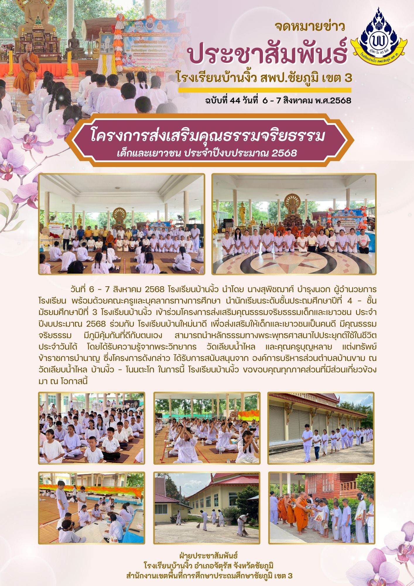 2 | วันที่ 6 - 7 สิงหาคม 2568 โรงเรียนบ้านงิ้ว นำโดย นางสุพิชฌาศ์ บำรุงนอก ผู้อำนวยการโรงเรียน พร้อมด้วยคณะครูและบุคลากรทางการศึกษา นำนักเรียนระดับชั้นประถมศึกษาปีที่ 4 - ชั้นมัธยมศึกษาปีที่ 3 โรงเรียนบ้านงิ้ว เข้าร่วมโครงการส่งเสริมคุณธรรมจริยธรรมเด็กและเยาวชน ประจำปีงบประมาณ 2568 ร่วมกับ โรงเรียนบ้านใหม่นาดี เพื่อส่งเสริมให้เด็กและเยาวชนเป็นคนดี มีคุณธรรม จริยธรรม มีภูมิคุ้มกันที่ดีกับตนเอง สามารถนำหลักธรรมทางพระพุทธศาสนาไปประยุกต์ใช้ในชีวิตประจำวันได้