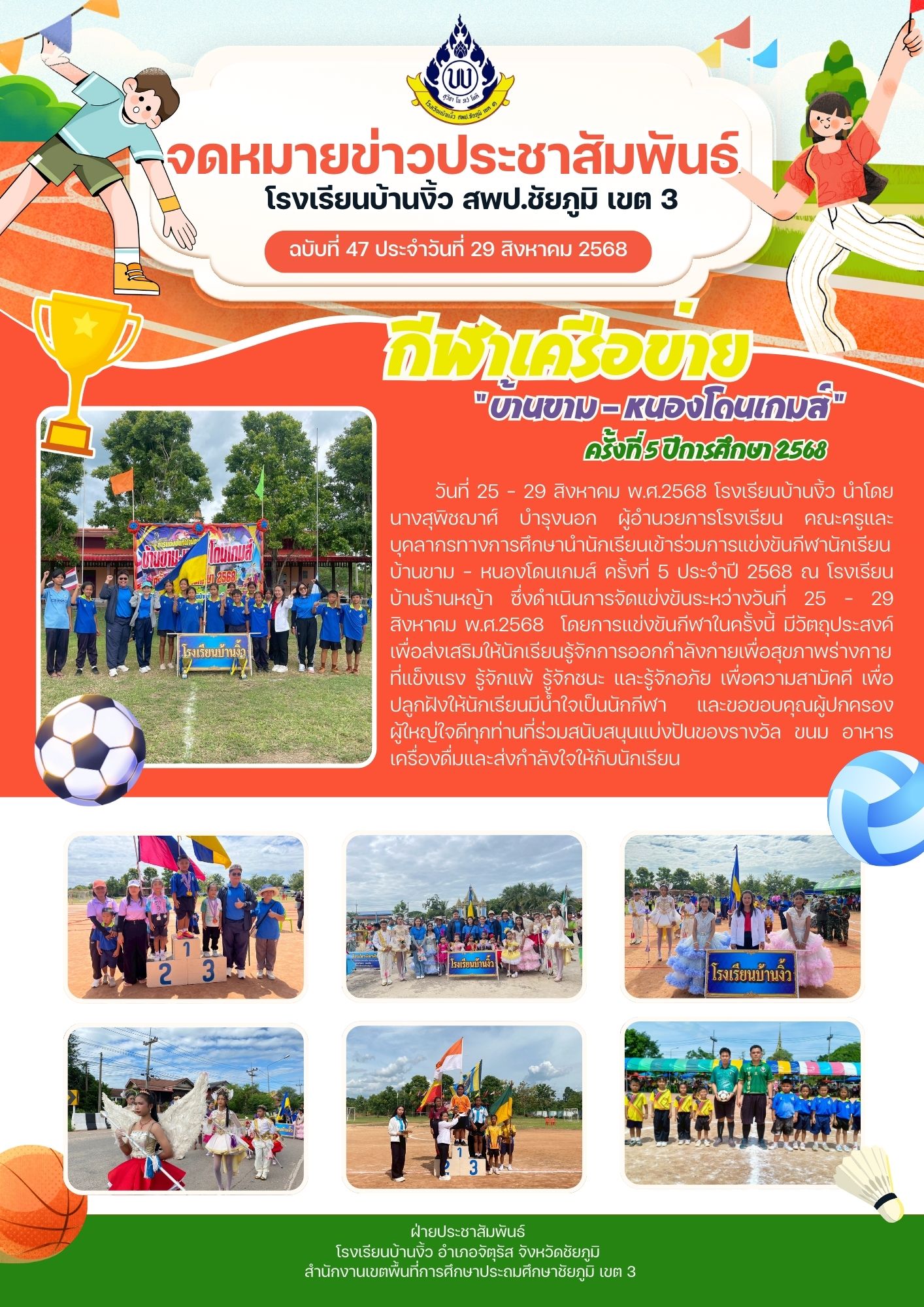6 | วันที่ 25 - 29 สิงหาคม พ.ศ.2568 โรงเรียนบ้านงิ้ว นำโดย นางสุพิชฌาศ์ บำรุงนอก ผู้อำนวยการโรงเรียน คณะครูและบุคลากรทางการศึกษานำนักเรียนเข้าร่วมการแข่งขันกีฬานักเรียนบ้านขาม - หนองโดนเกมส์ ครั้งที่ 5 ประจำปี 2568 ณ โรงเรียนบ้านร้านหญ้า ซึ่งดำเนินการจัดแข่งขันระหว่างวันที่ 25 - 29 สิงหาคม พ.ศ.2568 โดยการแข่งขันกีฬาในครั้งนี้ มีวัตถุประสงค์เพื่อส่งเสริมให้นักเรียนรู้จักการออกกำลังกายเพื่อสุขภาพร่างกายที่แข็งแรง รู้จักแพ้ รู้จักชนะ และรู้จักอภัย เพื่อความสามัคคี เพื่อปลูกฝังให้นักเรียนมีน้ำใจเป็นนักกีฬา และขอขอบคุณผู้ปกครอง ผู้ใหญ่ใจดีทุกท่านที่ร่วมสนับสนุนแบ่งปันของรางวัล ขนม อาหาร เครื่องดื่มและส่งกำลังใจให้กับนักเรียน