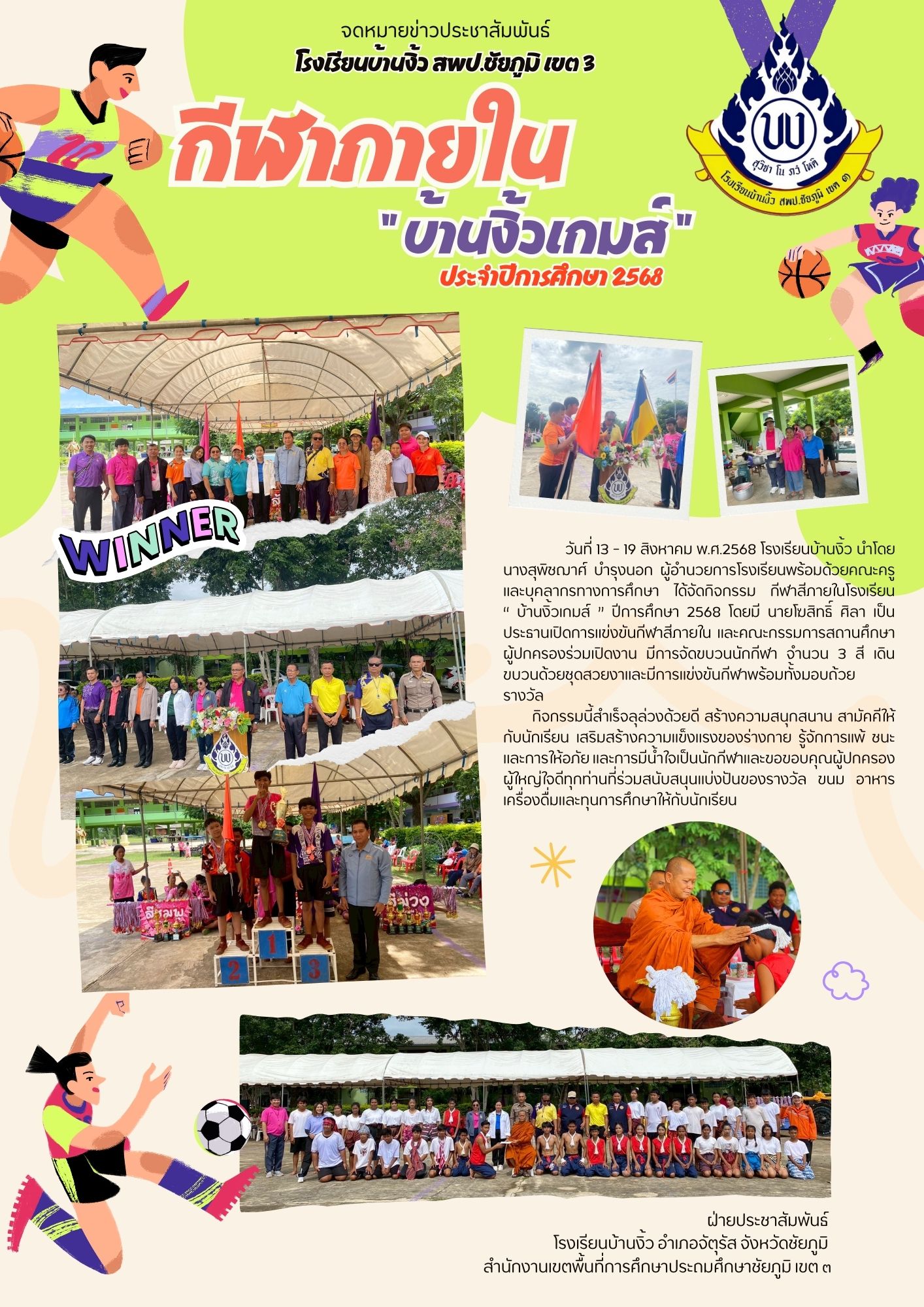 5 | วันที่ 13 - 19 สิงหาคม พ.ศ.2568 โรงเรียนบ้านงิ้ว นำโดย นางสุพิชฌาศ์ บำรุงนอก ผู้อำนวยการโรงเรียนพร้อมด้วยคณะครูและบุคลากรทางการศึกษา ได้จัดกิจกรรม กีฬาสีภายในโรงเรียน “ บ้านงิ้วเกมส์ ” ปีการศึกษา 2568 โดยมี นายโฆสิทธิ์ ศิลา เป็นประธานเปิดการแข่งขันกีฬาสีภายใน และคณะกรรมการสถานศึกษา ผู้ปกครองร่วมเปิดงาน มีการจัดขบวนนักกีฬา จำนวน 3 สี เดินขบวนด้วยชุดสวยงาและมีการแข่งขันกีฬาพร้อมทั้งมอบถ้วยรางวัล