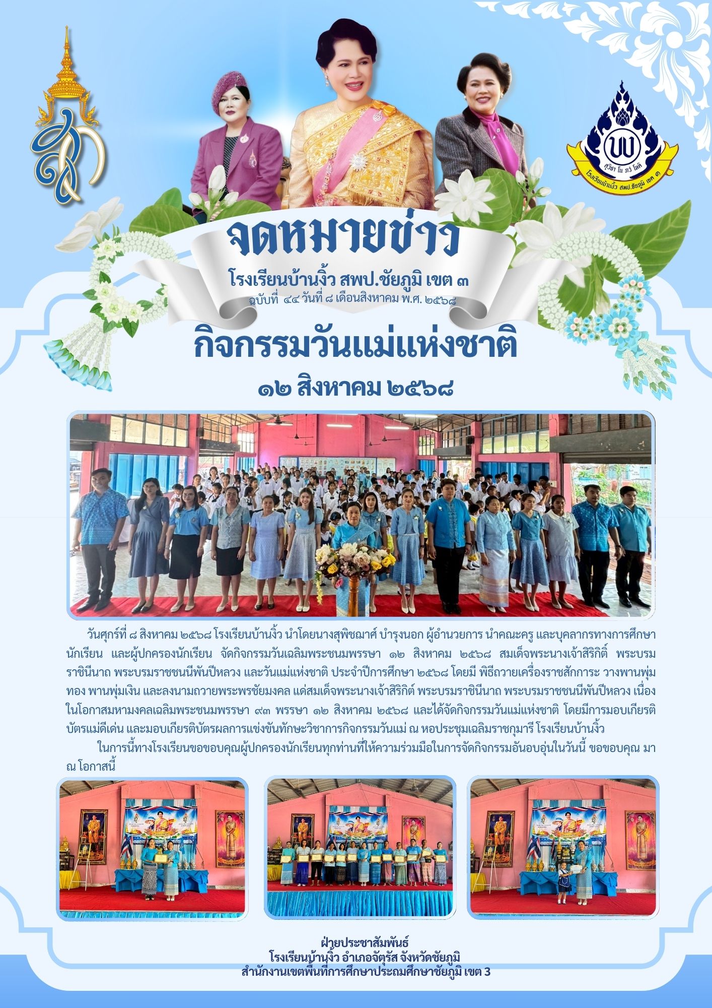 3 | วันศุกร์ที่ ๘ สิงหาคม ๒๕๖๘ โรงเรียนบ้านงิ้ว นำโดยนางสุพิชฌาศ์ บำรุงนอก ผู้อำนวยการ นำคณะครู และบุคลากรทางการศึกษา นักเรียน และผู้ปกครองนักเรียน จัดกิจกรรมวันเฉลิมพระชนมพรรษา ๑๒ สิงหาคม ๒๕๖๘ สมเด็จพระนางเจ้าสิริกิติ์ พระบรมราชินีนาถ พระบรมราชชนนีพันปีหลวง และวันแม่แห่งชาติ ประจำปีการศึกษา ๒๕๖๘ โดยมี พิธีถวายเครื่องราชสักการะ วางพานพุ่มทอง พานพุ่มเงิน และลงนามถวายพระพรชัยมงคล แด่สมเด็จพระนางเจ้าสิริกิต์ พระบรมราชินีนาถ พระบรมราชชนนีพันปีหลวง เนื่องในโอกาสมหามงคลเฉลิมพระชนมพรรษา ๙๓ พรรษา ๑๒ สิงหาคม ๒๕๖๘ และได้จัดกิจกรรมวันแม่แห่งชาติ โดยมีการมอบเกียรติบัตรแม่ดีเด่น และมอบเกียรติบัตรผลการแข่งขันทักษะวิชาการกิจกรรมวันแม่ ณ หอประชุมเฉลิมราชกุมารี โรงเรียนบ้านงิ้ว
