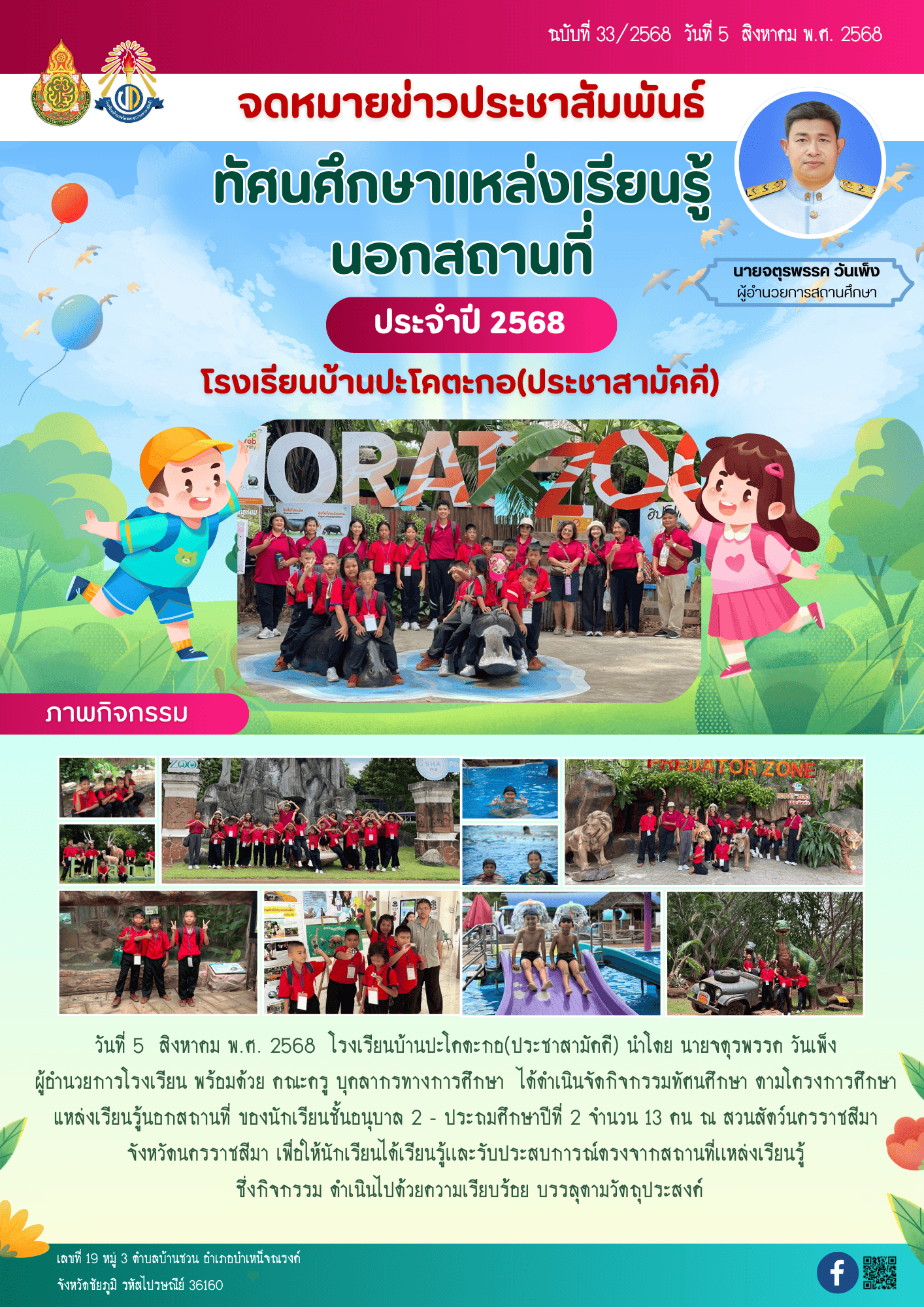 1 | ในวันที่ 5 สิงหาคม พ.ศ. 2568 โรงเรียนบ้านปะโคตะกอ(ประชาสามัคคี) นำโดย นายจตุรพรรค วันเพ็ง ผู้อำนวยการโรงเรียน พร้อมด้วย คณะครู บุคลากรทางการศึกษา ได้ดำเนินจัดกิจกรรมทัศนศึกษา ตามโครงการศึกษาแหล่งเรียนรู้นอกสถานที่ ของนักเรียนชั้นอนุบาล 2 - ประถมศึกษาปีที่ 2 จำนวน 13 คน ณ สวนสัตว์นครราชสีมา จังหวัดนครราชสีมา เพื่อให้นักเรียนได้เรียนรู้เเละรับประสบการณ์ตรงจากสถานที่เเหล่งเรียนรู้