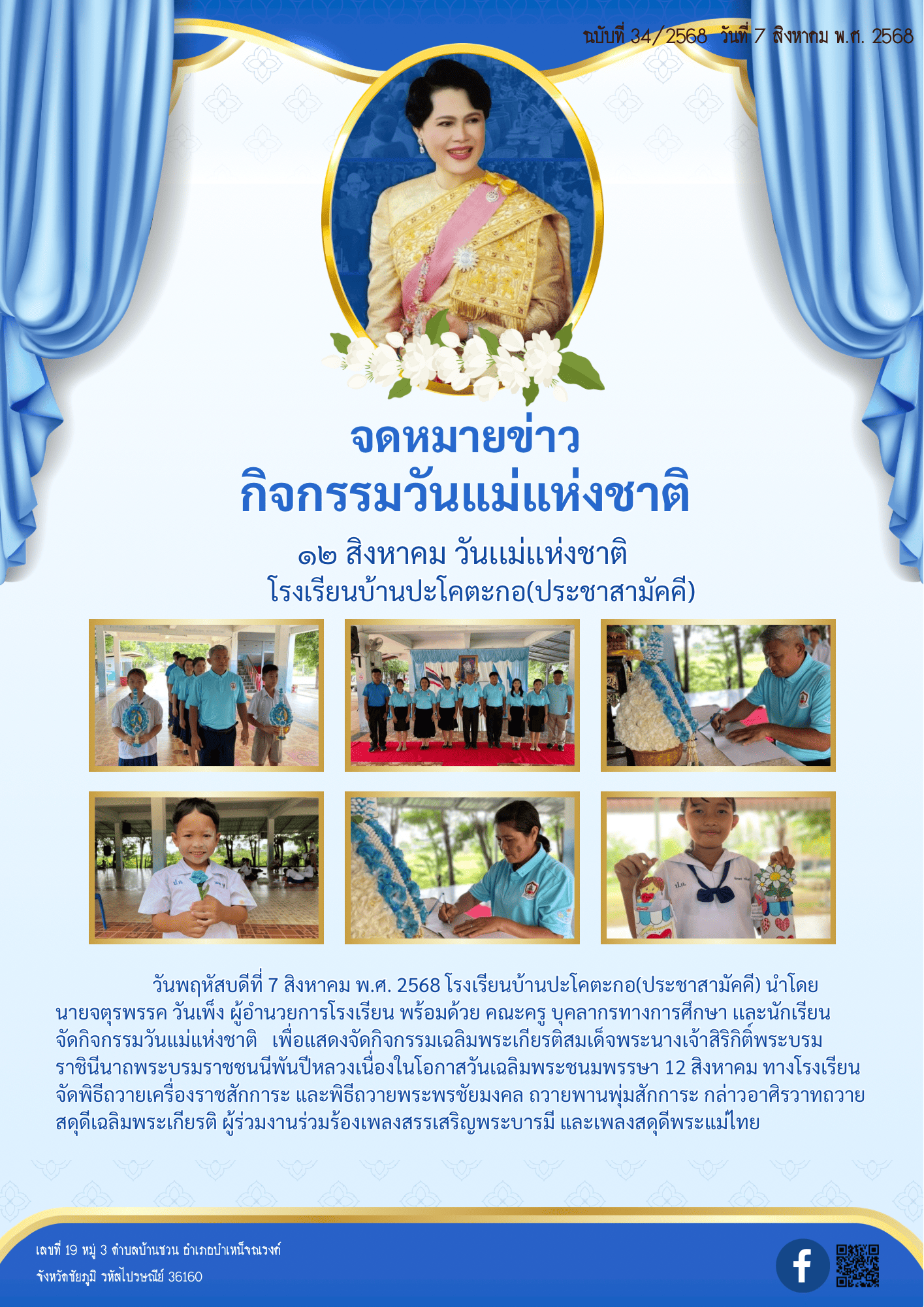 2 | ในวันพฤหัสบดีที่ 7 สิงหาคม พ.ศ. 2568 โรงเรียนบ้านปะโคตะกอ(ประชาสามัคคี) นำโดย นายจตุรพรรค วันเพ็ง ผู้อำนวยการโรงเรียน พร้อมด้วย คณะครู บุคลากรทางการศึกษา เเละนักเรียน จัดกิจกรรมวันแม่แห่งชาติ เพื่อแสดงจัดกิจกรรมเฉลิมพระเกียรติสมเด็จพระนางเจ้าสิริกิติ์พระบรมราชินีนาถพระบรมราชชนนีพันปีหลวงเนื่องในโอกาสวันเฉลิมพระชนมพรรษา 12 สิงหาคม ทางโรงเรียนจัดพิธีถวายเครื่องราชสักการะ และพิธีถวายพระพรชัยมงคล ถวายพานพุ่มสักการะ กล่าวอาศิรวาทถวายสดุดีเฉลิมพระเกียรติ ผู้ร่วมงานร่วมร้องเพลงสรรเสริญพระบารมี และเพลงสดุดีพระแม่ไทย |