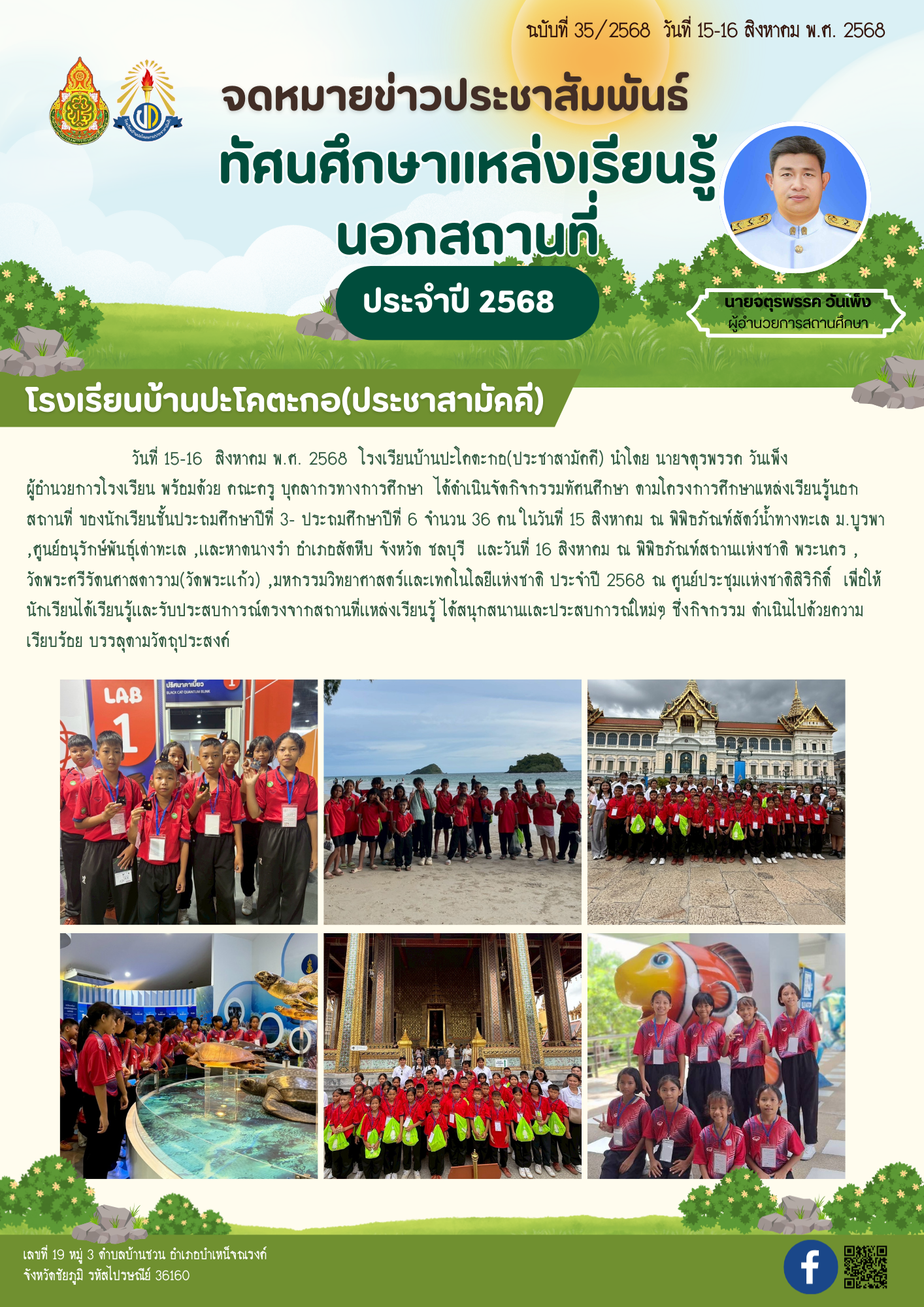 วันที่ 15-16 สิงหาคม พ.ศ. 2568 โรงเรียนบ้านปะโคตะกอ(ประชาสามัคคี) นำโดย นายจตุรพรรค วันเพ็งผู้อำนวยการโรงเรียน พร้อมด้วย คณะครู บุคลากรทางการศึกษา ได้ดำเนินจัดกิจกรรมทัศนศึกษา ตามโครงการศึกษาแหล่งเรียนรู้นอกสถานที่ ของนักเรียนชั้นประถมศึกษาปีที่ 3- ประถมศึกษาปีที่ 6 จำนวน 36 คน ในวันที่ 15 สิงหาคม ณ พิพิธภัณฑ์สัตว์น้ำทางทะเล ม.บูรพา ,ศูนย์อนุรักษ์พันธุ์เต่าทะเล ,เเละหาดนางรำ อำเภอสัตหีบ จังหวัด ชลบุรี เเละวันที่ 16 สิงหาคม ณ พิพิธภัณฑ์สถานเเห่งชาติ พระนคร ,วัดพระศรีรัตนศาสดาราม(วัดพระเเก้ว) ,มหกรรมวิทยาศาสตร์เเละเทคโนโลยีเเห่งชาติ ประจำปี 2568 ณ ศูนย์ประชุมเเห่งชาติสิริกิติ์ เพื่อให้นักเรียนได้เรียนรู้เเละรับประสบการณ์ตรงจากสถานที่เเหล่งเรียนรู้ ได้สนุกสนานเเละประสบการณ์ใหม่ๆ