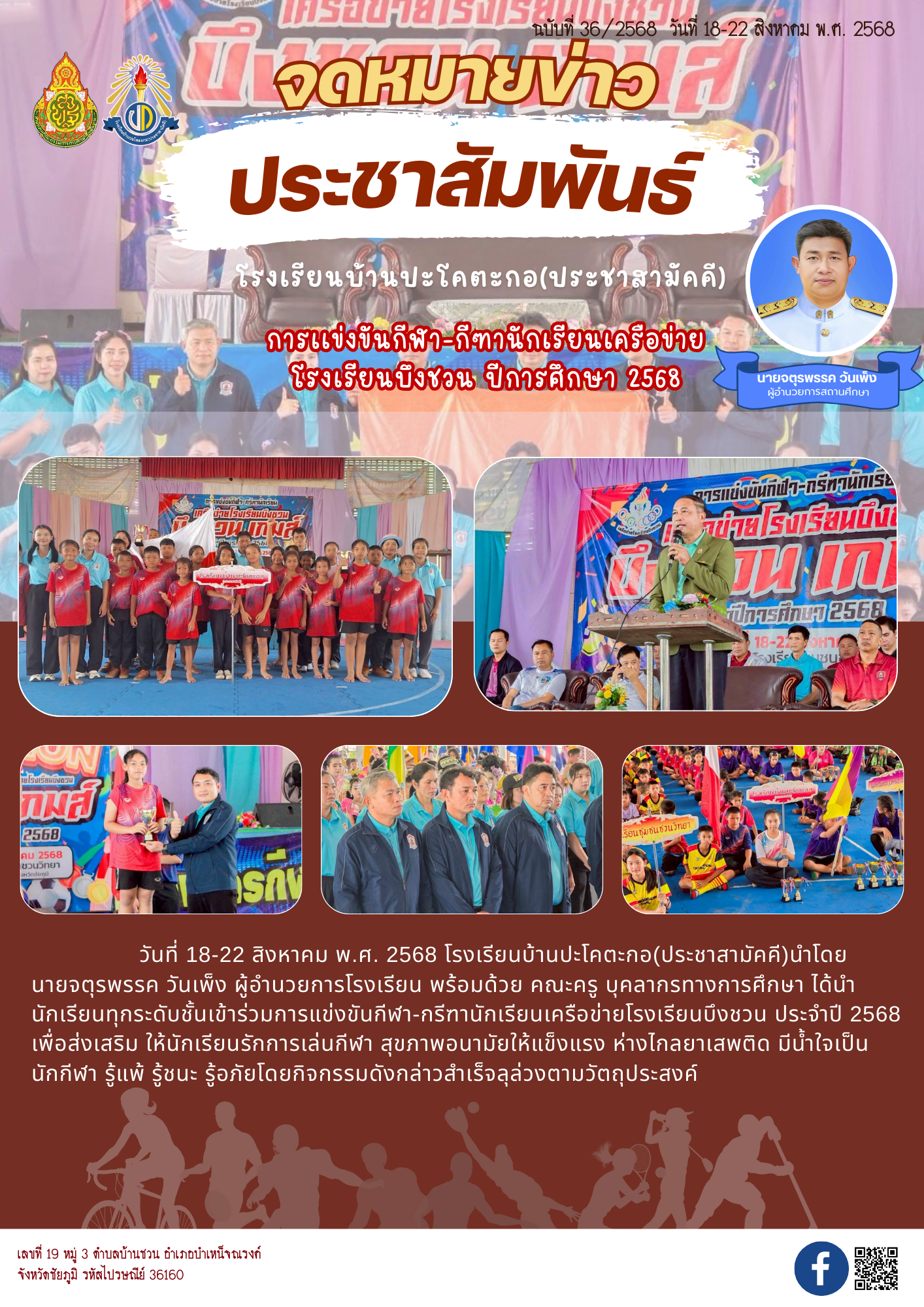 วันที่ 18-22 สิงหาคม พ.ศ. 2568 โรงเรียนบ้านปะโคตะกอ(ประชาสามัคคี)นำโดยนายจตุรพรรค วันเพ็ง ผู้อำนวยการโรงเรียน พร้อมด้วย คณะครู บุคลากรทางการศึกษา ได้นำนักเรียนทุกระดับชั้นเข้าร่วมการแข่งขันกีฬา-กรีฑานักเรียนเครือข่ายโรงเรียนบึงชวน ประจำปี 2568 เพื่อส่งเสริม ให้นักเรียนรักการเล่นกีฬา สุขภาพอนามัยให้แข็งแรง ห่างไกลยาเสพติด มีน้ำใจเป็นนักกีฬา รู้แพ้ รู้ชนะ รู้อภัย