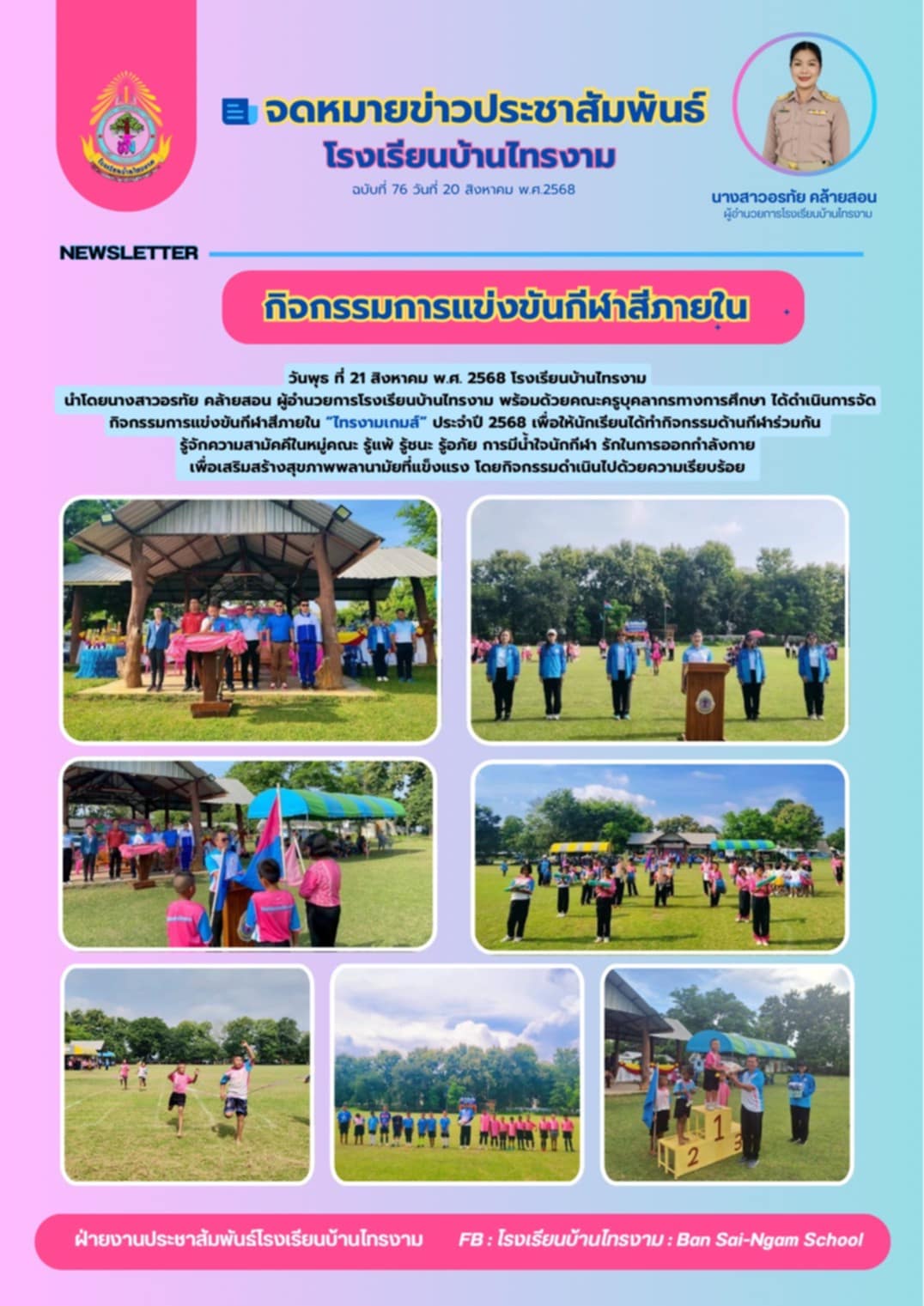 4 | วันพุธที่ ๒๐ สิงหาคม ๒๕๖๘ โรงเรียนบ้านไทรงาม นำโดยนางสาวอรทัย คล้ายสอน ผ้อำนวยการโรงเรียนบ้านไทรงาม พร้อมด้วยคณะครูบุคลากรทางกาารศึกษา คณะกรรมการสถานศึกษาขั้นพื้นฐาน ผู้นำชุมชน ผู้ปกครอง นักเรียนโรงเรียนบ้านไทรงาม ร่วมกันจัดกิจกรรมกีฬาสีภายใน "ไทรงามเกมส์" ประจำปีการศึกษา ๒๕๖๘