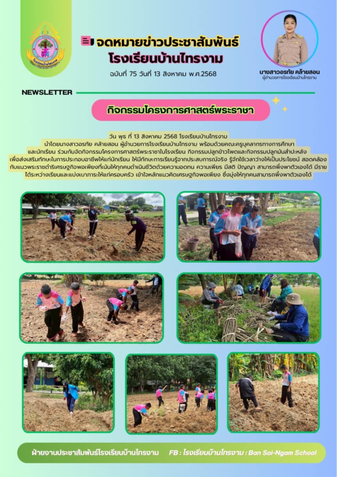 3 | วันพุธที่ ๑๓ สิงหาคม ๒๕๖๘ โรงเรียนบ้านไทรงาม นำโดยนางสาวอรทัย คล้ายสอน คณะครูบุคลากรทางการศึกษาและนักเรียน ร่วมกันดำเนินกิจกรรมโครงการศาสตร์พระราชาในโรงเรียน กิจกรรมปลูกข้าวโพดและมันสำปะะหลัง