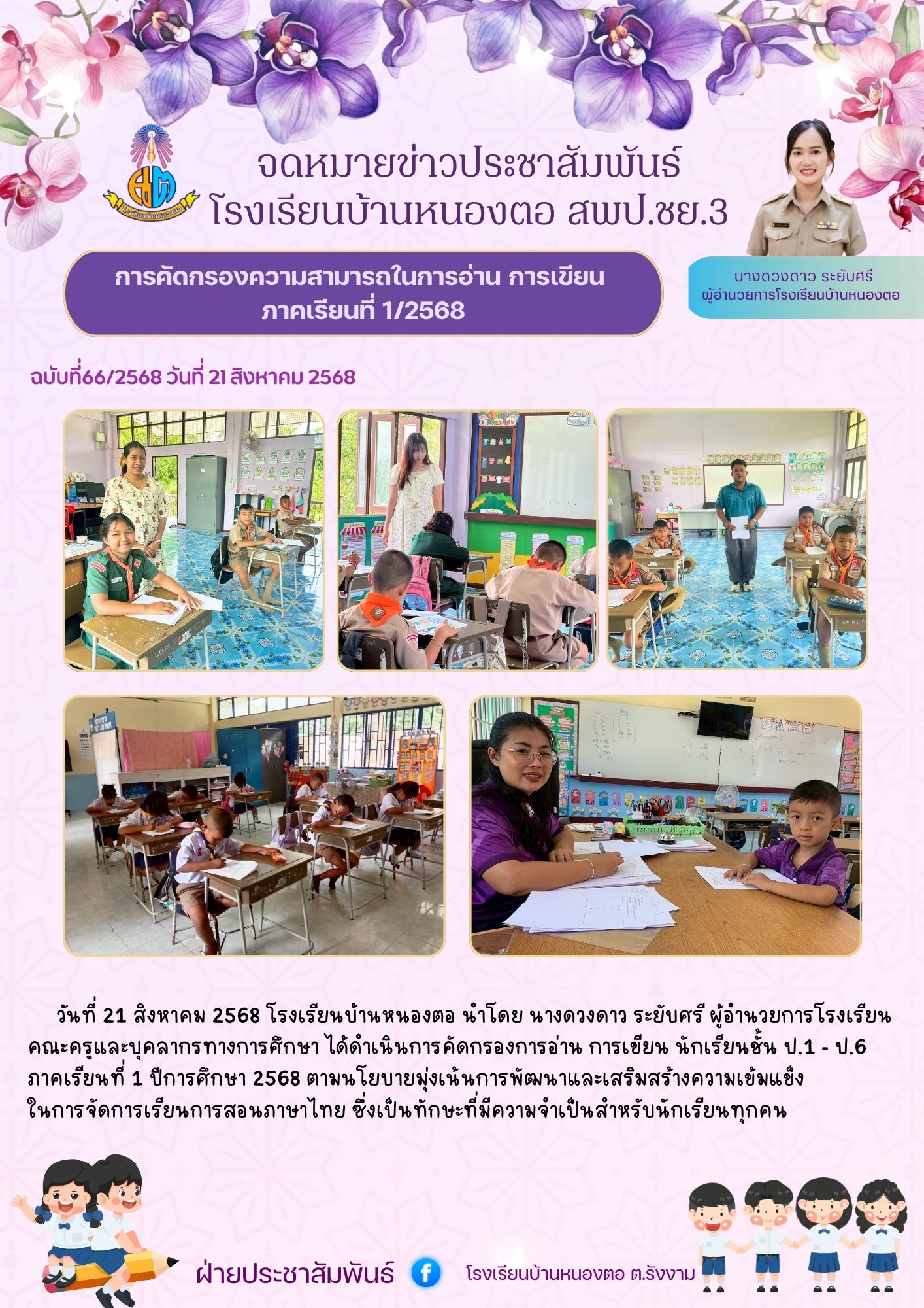 วันที่ 21 สิงหาคม 2568 โรงเรียนบ้านหนองตอ นำโดย นางดวงดาว ระยับศรี ผู้อำนวยการโรงเรียน คณะครูและบุคลากรทางการศึกษา ได้ดำเนินการคัดกรองการอ่าน การเขียน นักเรียนชั้น ป.1 - ป.6 ภาคเรียนที่ 1 ปีการศึกษา 2568 ตามนโยบายมุ่งเน้นการพัฒนาและเสริมสร้างความเข้มแข็งในการจัดการเรียนการสอนภาษาไทย ซึ่งเป็นทักษะที่มีความจำเป็นสำหรับนักเรียนทุกคน