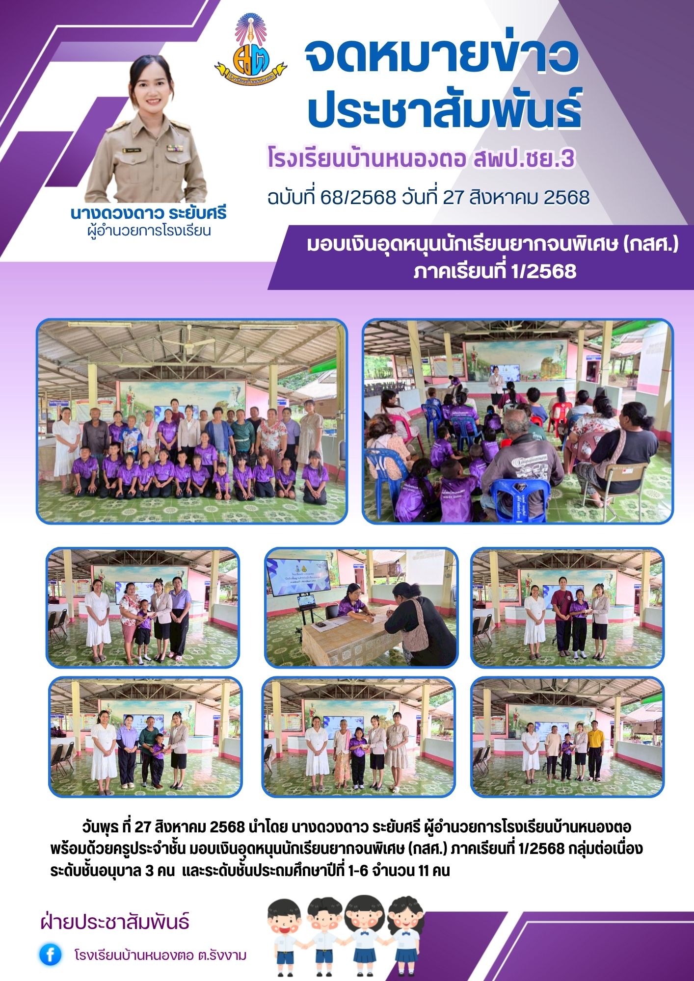 วันพุธ ที่ 27 สิงหาคม 2568 นำโดย นางดวงดาว ระยับศรี ผู้อำนวยการโรงเรียนบ้านหนองตอ พร้อมด้วยครูประจำชั้น มอบเงินอุดหนุนนักเรียนยากจนพิเศษ (กสศ.) ภาคเรียนที่ 1/2568 กลุ่มต่อเนื่อง ระดับชั้นอนุบาล 3 คน และระดับชั้นประถมศึกษาปีที่ 1-6 จำนวน 11 คน