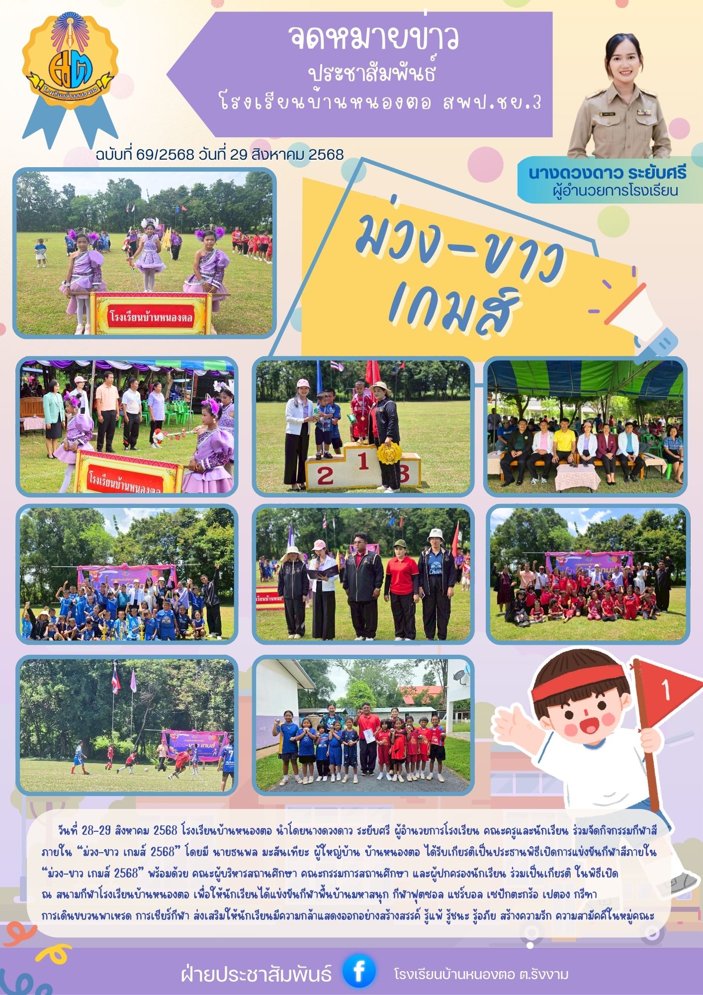 วันที่ 28-29 สิงหาคม 2568 โรงเรียนบ้านหนองตอ นำโดยนางดวงดาว ระยับศรี ผู้อำนวยการโรงเรียน คณะครูและนักเรียน ร่วมจัดกิจกรรมกีฬาสีภายใน “ม่วง-ขาว เกมส์ 2568” โดยมี นายธนพล มะสันเทียะ ผู้ใหญ่บ้าน บ้านหนองตอ ได้รับเกียรติเป็นประธานพิธีเปิดการแข่งขันกีฬาสีภายใน “ม่วง-ขาว เกมส์ 2568” พร้อมด้วย คณะผู้บริหารสถานศึกษา คณะกรรมการสถานศึกษา และผู้ปกครองนักเรียน ร่วมเป็นเกียรติ ในพิธีเปิด