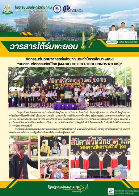 7 | วันศุกร์ที่ ๒๒ สิงหาคม ๒๕๖๘ โรงเรียนซับใหญ่วิทยาคม นำโดย ดร.ปัณณวิทย์ ดีอุดม ผู้อำนวยการโรงเรียนซับใหญ่วิทยาคม พร้อมด้วยว่าที่ร้อยตรีธีรวิทย์ เมืองสุบาล นายชวิศ นาทบรรลือ รองผู้อำนวยการโรงเรียน พร้อมคณะครู บุคลากรทางการศึกษา และนักเรียน ได้ร่วมกันจัดกิจกรรมสัปดาห์วันวิทยาศาสตร์ เพื่อเป็นการเฉลิมพระเกียรติพระบาทสมเด็จพระจอมเกล้าเจ้าอยู่หัว รัชกาลที่ ๔ พระบิดาแห่งวิทยาศาสตร์ไทย ภายในงาน มีกิจกรรมการแข่งขันยอดนักประดิษฐ์พิทักษ์ไข่ มือกลจอมพลัง เรือรักษ์พิทักษ์ชีวิต จรวดขวดน้ำ การประกวดชุดแฟนซี กิจกรรมเต็มไปด้วยความสนุกสนานและพลังแห่งความคิดสร้างสรรค์ มุ่งเน้นให้นักเรียนได้ทั้งความรู้ ความคิดสร้างสรรค์ และการแสดงออกอย่างมั่นใจพร้อมปลูกฝังแรงบันดาลใจในการเรียนรู้วิทยาศาสตร์ |