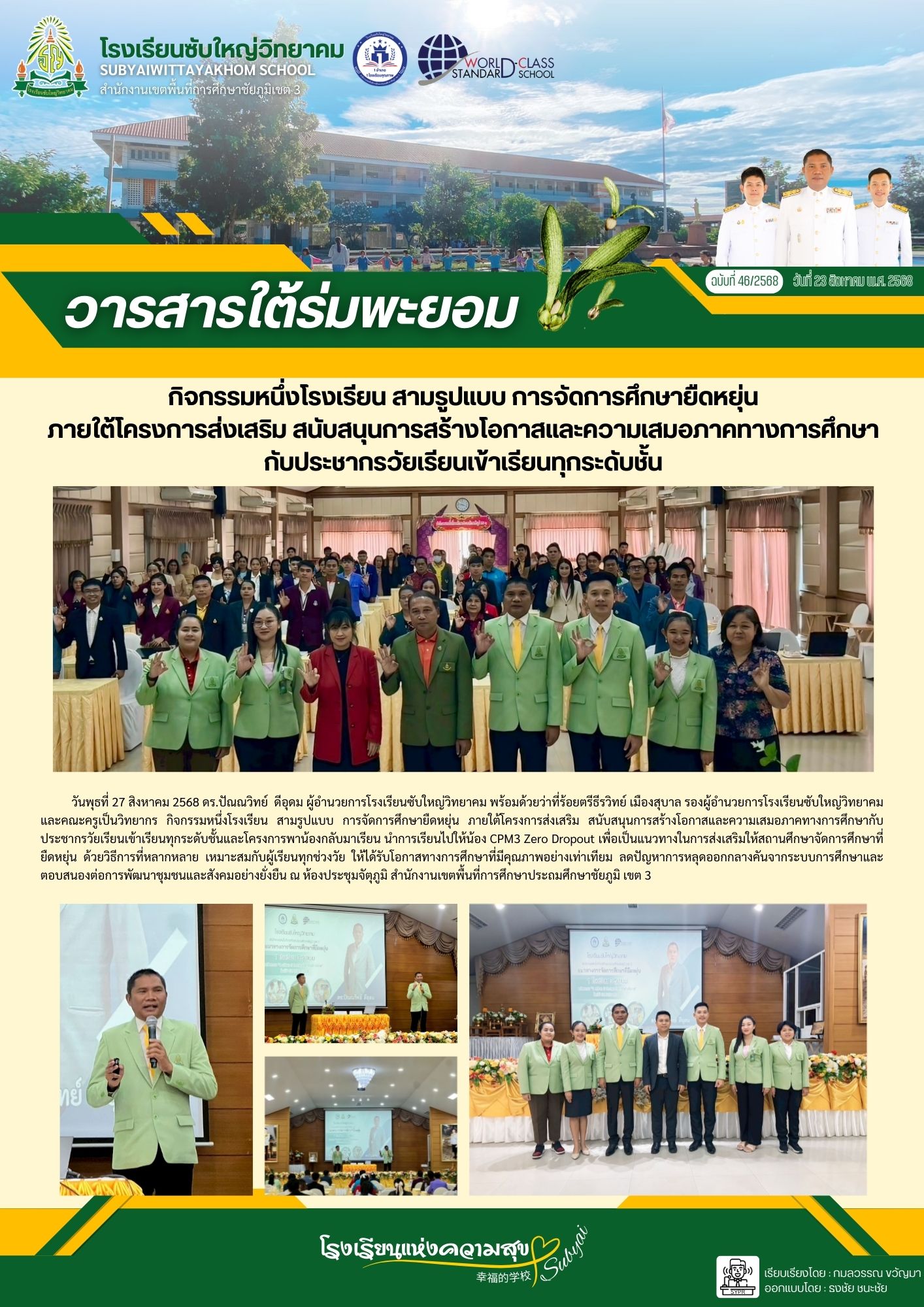 9 | วันพุธที่ 27 สิงหาคม 2568 ดร.ปัณณวิทย์ ดีอุดม ผู้อำนวยการโรงเรียนซับใหญ่วิทยาคม พร้อมด้วยว่าที่ร้อยตรีธีรวิทย์ เมืองสุบาล รองผู้อำนวยการโรงเรียนซับใหญ่วิทยาคม และคณะครูเป็นวิทยากร กิจกรรมหนึ่งโรงเรียน สามรูปแบบ การจัดการศึกษายืดหยุ่น ภายใต้โครงการส่งเสริม สนับสนุนการสร้างโอกาสและความเสมอภาคทางการศึกษากับประชากรวัยเรียนเข้าเรียนทุกระดับชั้นและโครงการพาน้องกลับมาเรียน นำการเรียนไปให้น้อง CPM3 Zero Dropout เพื่อเป็นแนวทางในการส่งเสริมให้สถานศึกษาจัดการศึกษาที่ยืดหยุ่น ด้วยวิธีการที่หลากหลาย เหมาะสมกับผู้เรียนทุกช่วงวัย ให้ได้รับโอกาสทางการศึกษาที่มีคุณภาพอย่างเท่าเทียม ลดปัญหาการหลุดออกกลางคันจากระบบการศึกษาและตอบสนองต่อการพัฒนาชุมชนและสังคมอย่างยั่งยืน ณ ห้องประชุมจัตุภูมิ สำนักงานเขตพื้นที่การศึกษาประถมศึกษาชัยภูมิ เขต 3