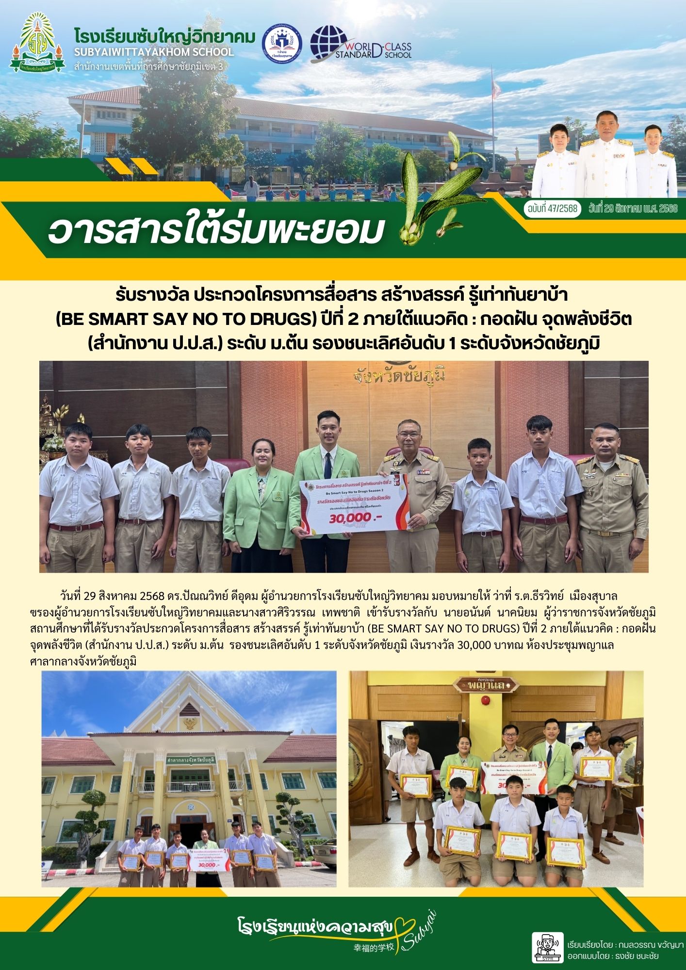 10 | วันที่ 29 สิงหาคม 2568 ดร.ปัณณวิทย์ ดีอุดม ผู้อำนวยการโรงเรียนซับใหญ่วิทยาคม มอบหมายให้ ว่าที่ ร.ต.ธีรวิทย์ เมืองสุบาล ฃรองผู้อำนวยการโรงเรียนซับใหญ่วิทยาคมและนางสาวศิริวรรณ เทพชาติ เข้ารับรางวัลกับ นายอนันต์ นาคนิยม ผู้ว่าราชการจังหวัดชัยภูมิ สถานศึกษาที่ได้รับรางวัลประกวดโครงการสื่อสาร สร้างสรรค์ รู้เท่าทันยาบ้า (BE SMART SAY NO TO DRUGS) ปีที่ 2 ภายใต้แนวคิด : กอดฝัน จุดพลังชีวิต (สำนักงาน ป.ป.ส.) ระดับ ม.ต้น รองชนะเลิศอันดับ 1 ระดับจังหวัดชัยภูมิ เงินรางวัล 30,000 บาทณ ห้องประชุมพญาแล ศาลากลางจังหวัดชัยภูมิ |