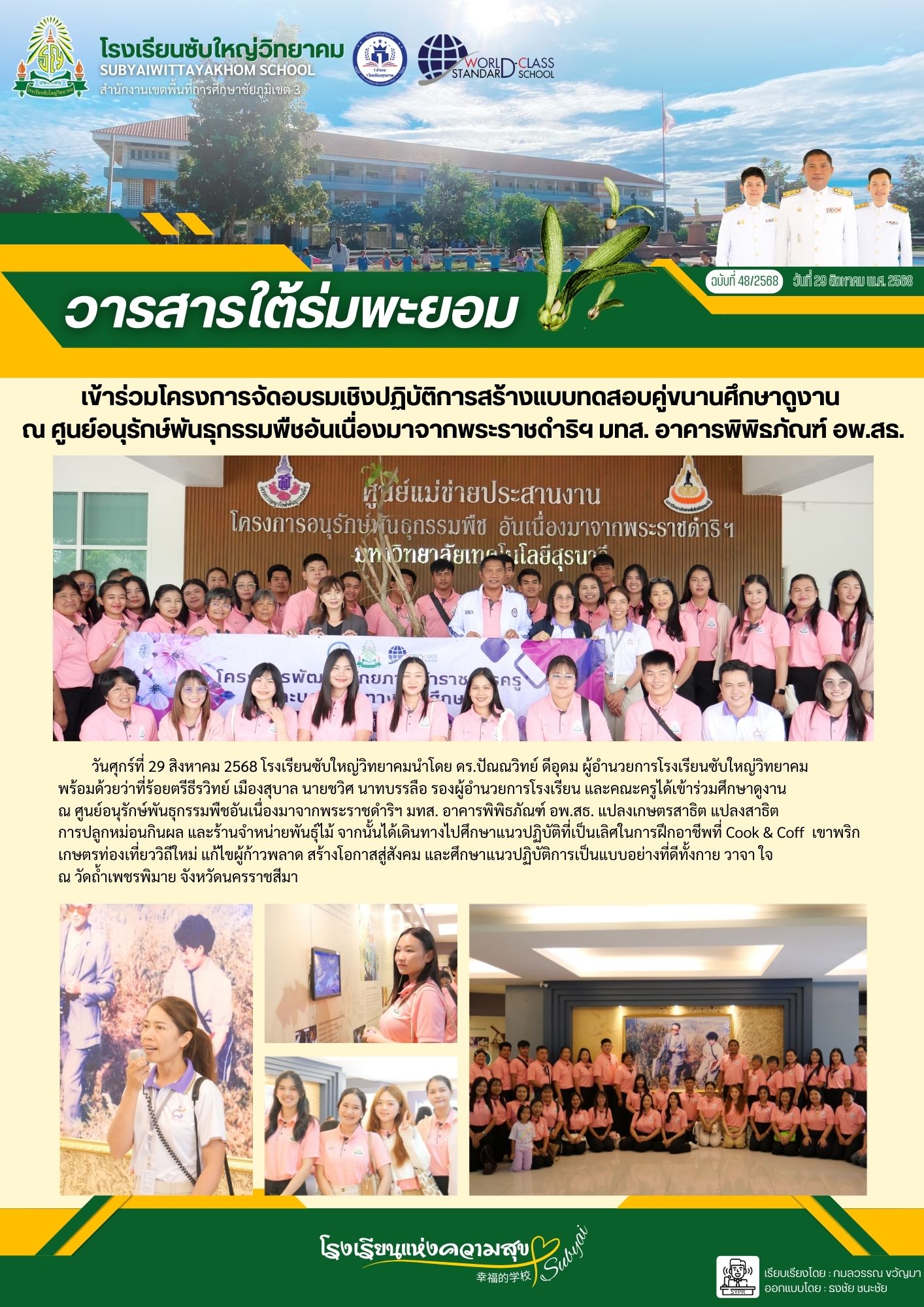 11 | วันศุกร์ที่ 29 สิงหาคม 2568 โรงเรียนซับใหญ่วิทยาคมนำโดย ดร.ปัณณวิทย์ ดีอุดม ผู้อำนวยการโรงเรียนซับใหญ่วิทยาคม พร้อมด้วยว่าที่ร้อยตรีธีรวิทย์ เมืองสุบาล นายชวิศ นาทบรรลือ รองผู้อำนวยการโรงเรียน และคณะครูได้เข้าร่วมศึกษาดูงาน ณ ศูนย์อนุรักษ์พันธุกรรมพืชอันเนื่องมาจากพระราชดำริฯ มทส. อาคารพิพิธภัณฑ์ อพ.สธ. แปลงเกษตรสาธิต แปลงสาธิต การปลูกหม่อนกินผล และร้านจำหน่ายพันธุ์ไม้ จากนั้นได้เดินทางไปศึกษาแนวปฏิบัติที่เป็นเลิศในการฝึกอาชีพที่ Cook & Coff เขาพริก เกษตรท่องเที่ยววิถีใหม่ แก้ไขผู้ก้าวพลาด สร้างโอกาสสู่สังคม และศึกษาแนวปฏิบัติการเป็นแบบอย่างที่ดีทั้งกาย วาจา ใจ ณ วัดถ้ำเพชรพิมาย จังหวัดนครราชสีมา |