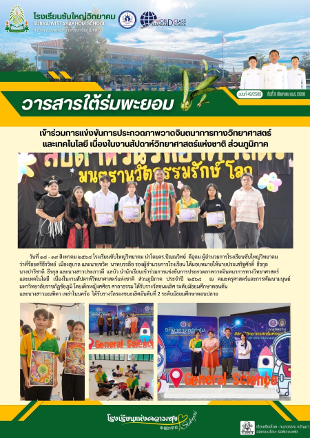 และเทคโนโลยี เนื่องในงานสัปดาห์วิทยาศาสตร์แห่งชาติ ส่วนภูมิภาค ประจำปี ๒๕๖๘ ณ คณะครุศาสตร์และการพัฒนามนุษย์ มหาวิทยาลัยราชภัฎชัยภูมิ โดยเด็กหญิงศศิธร ศาลาธรรม ได้รับรางวัลชนะเลิศ ระดับมัธยมศึกษาตอนต้น