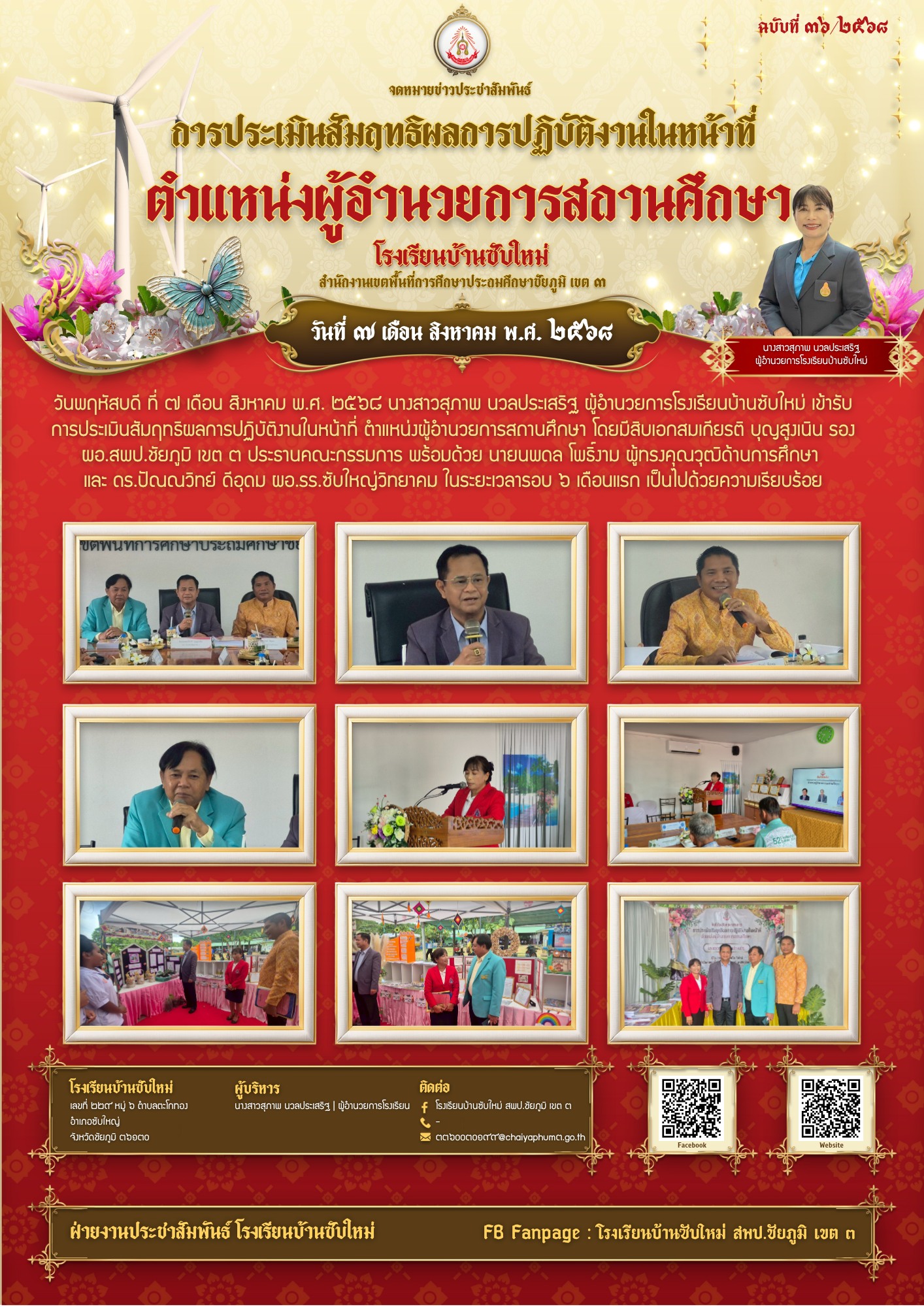 2 | วันพฤหัสบดี ที่ ๗ เดือน สิงหาคม พ.ศ. ๒๕๖๘ นางสาวสุภาพ นวลประเสริฐ ผู้อำนวยการโรงเรียนบ้านซับใหม่ เข้ารับการประเมินสัมฤทธิผลการปฏิบัติงานในหน้าที่ ตำแหน่งผู้อำนวยการสถานศึกษา โดยมีสิบเอกสมเกียรติ บุญสูงเนิน รอง ผอ.สพป.ชัยภูมิ เขต ๓ ประธานคณะกรรมการ พร้อมด้วย นายนพดล โพธิ์งาม ผู้ทรงคุณวุฒิด้านการศึกษา และ ดร.ปัณณวิทย์ ดีอุดม ผอ.รร.ซับใหญ่วิทยาคม ในระยะเวลารอบ ๖ เดือนแรก เป็นไปด้วยความเรียบร้อย