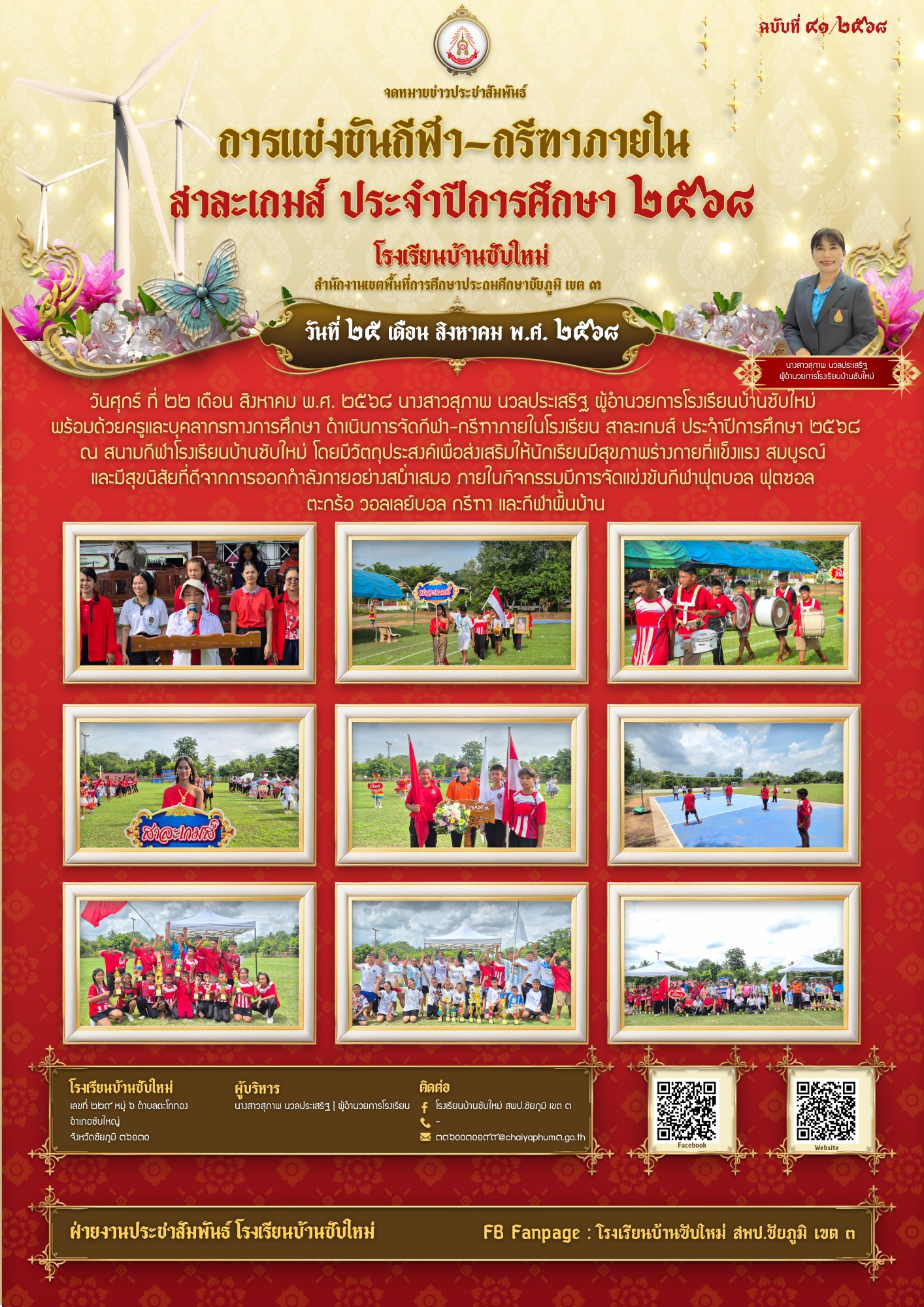 7 | วันศุกร์ ที่ ๒๒ เดือน สิงหาคม พ.ศ. ๒๕๖๘ นางสาวสุภาพ นวลประเสริฐ ผู้อำนวยการโรงเรียนบ้านซับใหม่พร้อมด้วยครูและบุคลากรทางการศึกษา ดำเนินการจัดกีฬา-กรีฑาภายในโรงเรียน สาละเกมส์ ประจำปีการศึกษา ๒๕๖๘ ณ สนามกีฬาโรงเรียนบ้านซับใหม่ โดยมีวัตถุประสงค์เพื่อส่งเสริมให้นักเรียนมีสุขภาพร่างกายที่แข็งแรง สมบูรณ์ และมีสุขนิสัยที่ดีจากการออกกำลังกายอย่างสม่ำเสมอ ภายในกิจกรรมมีการจัดแข่งขันกีฬาฟุตบอล ฟุตซอล ตะกร้อ วอลเลย์บอล กรีฑา และกีฬาพื้นบ้าน