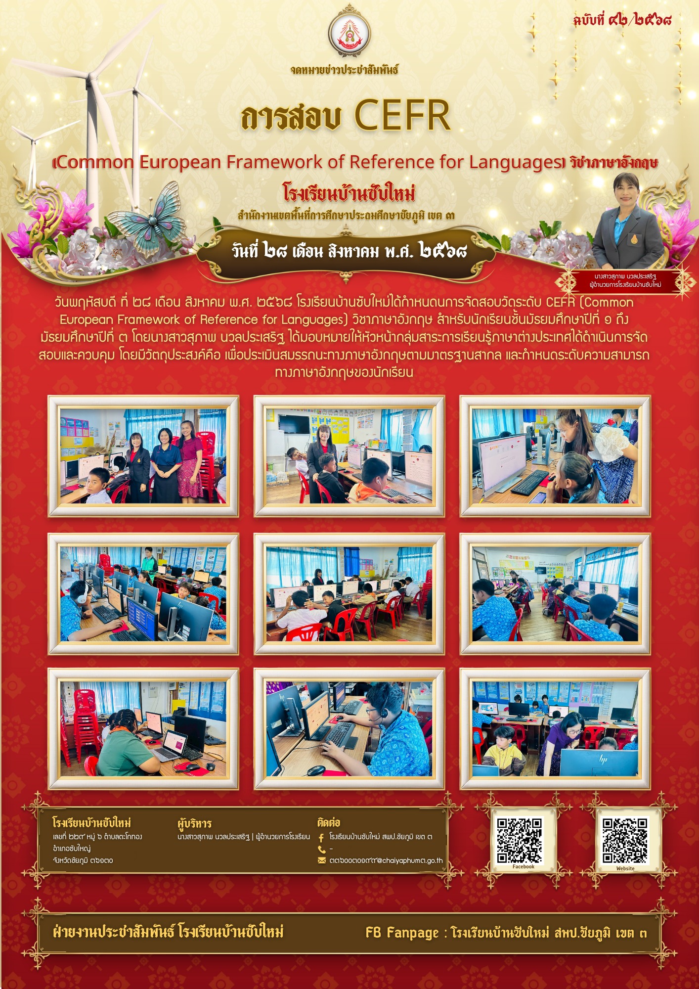 10 | วันพฤหัสบดี ที่ ๒๘ เดือน สิงหาคม พ.ศ. ๒๕๖๘ โรงเรียนบ้านซับใหม่ได้กำหนดนการจัดสอบวัดระดับ CEFR (Common European Framework of Reference for Languages) วิชาภาษาอังกฤษ สำหรับนักเรียนชั้นมัธยมศึกษาปีที่ ๑ ถึงมัธยมศึกษาปีที่ ๓ โดยนางสาวสุภาพ นวลประเสริฐ ได้มอบหมายให้หัวหน้ากลุ่มสาระการเรียนรู้ภาษาต่างประเทศได้ดำเนินการจัดสอบและควบคุม โดยมีวัตถุประสงค์คือ เพื่อประเมินสมรรถนะทางภาษาอังกฤษตามมาตรฐานสากล และกำหนดระดับความสามารถทางภาษาอังกฤษของนักเรียน