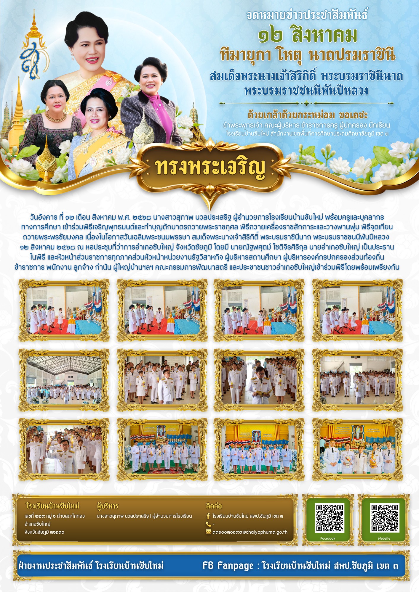 4 | วันอังคาร ที่ ๑๒ เดือน สิงหาคม พ.ศ. ๒๕๖๘ นางสาวสุภาพ นวลประเสริฐ ผู้อำนวยการโรงเรียนบ้านซับใหม่ พร้อมครูและบุคลากรทางการศึกษา เข้าร่วมพิธีเจริญพุทธมนต์และทำบุญตักบาตรถวายพระราชกุศล พิธีถวายเครื่องราชสักการะและวางพานพุ่ม พิธีจุดเทียนถวายพระพรชัยมงคล เนื่องในโอกาสวันเฉลิมพระชนมพรรษา สมเด็จพระนางเจ้าสิริกิติ์ พระบรมราชินีนาถ พระบรมราชชนนีพันปีหลวง ๑๒ สิงหาคม ๒๕๖๘ ณ หอประชุมที่ว่าการอำเภอซับใหญ่ จังหวัดชัยภูมิ โดยมี นายณัฐพศุตม์ โชติจิรศิริกุล นายอำเภอซับใหญ่ เป็นประธานในพิธี และหัวหน้าส่วนราชการทุกภาคส่วนหัวหน้าหน่วยงานรัฐวิสาหกิจ ผู้บริหารสถานศึกษา ผู้บริหารองค์กรปกครองส่วนท้องถิ่น ข้าราชการ พนักงาน ลูกจ้าง กำนัน ผู้ใหญ่บ้านฯลฯ คณะกรรมการพัฒนาสตรี และประชาชนชาวอำเภอซับใหญ่เข้าร่วมพิธีโดยพร้อมเพรียงกัน