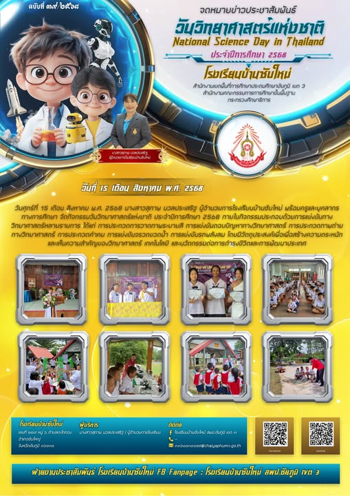 5 | วันศุกร์ที่ 15 เดือน สิงหาคม พ.ศ. 2568 นางสาวสุภาพ นวลประเสริฐ ผู้อำนวยการโรงเรีียนบ้านซับใหม่ พร้อมครูและบุคลากรทางการศึกษา จัดกิจกรรมวันวิทยาศาสตร์แห่งชาติ ประจำปีการศึกษา 2568 ภายในกิจกรรมประกอบด้วยการแข่งขันทางวิทยาศาสตร์หลายรายการ ได้แก่ การประกวดการวาดภาพระบายสี การแข่งขันตอบปัญหาทางวิทยาศาสตร์ การประกวดภาพถ่ายทางวิทยาศาสตร์ การประกวดคำคม การแข่งขันจรวดขวดน้ำ การแข่งขันรถพลังลม โดยมีวัตถุประสงค์เพื่อเพื่อสร้างความตระหนักและเห็นความสำคัญของวิทยาศาสตร์ เทคโนโลยี และนวัตกรรมต่อการดำรงชีวิตและการพัฒนาประเทศ