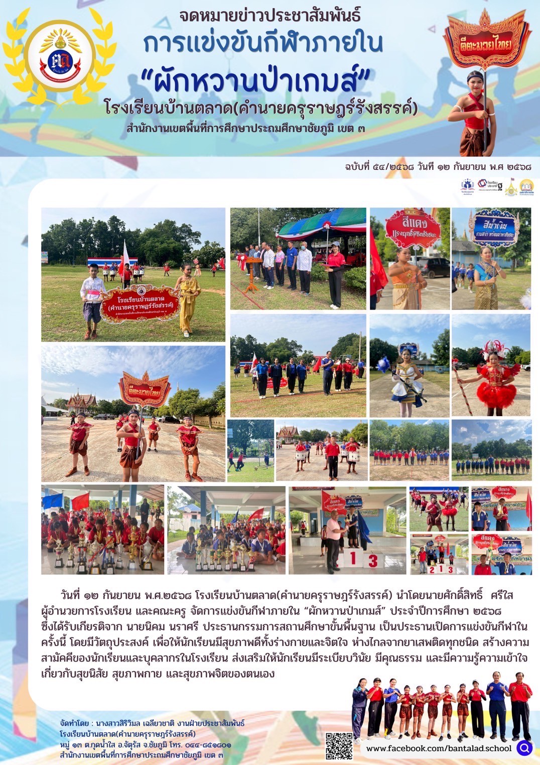 1 | การแข่งขันกีฬาภายใน "ผักหวานป่าเกมส์" วันที่ ๑๒ กันยายน พ.ศ.๒๕๖๘ โรงเรียนบ้านตลาด(คำนายครูราษฎร์รังสรรค์) นำโดยนายศักดิ์สิทธิ์ ศรีใส ผู้อำนวยการโรงเรียน และคณะครู จัดการแข่งขันกีฬาภายใน "ผักหวานป้าเกมส์" ประจำปีการศึกษา ๒๕๖๘ ซึ่งได้รับเกียรติจาก นายนิคม นราศรี ประธานกรรมการสถานศึกษาขั้นพื้นฐาน เป็นประธานเปิดการแข่งขันกีฬาในครั้งนี้ โดยมีวัตถุประสงค์ เพื่อให้นักเรียนมีสุขภาพดีทั้งร่างกายและจิตใจ ห่างไกลจากยาเสพติดทุกชนิด สร้างความสามัคคีของนักเรียนและบุคลากรในโรงเรียน ส่งเสริมให้นักเรียนมีระเบียบวินัย มีคุณธรรม และมีความรู้ความเข้าใจ เกี่ยวกับสุขนิสัย สุขภาพกาย และสุขภาพจิตของตนเอง |
