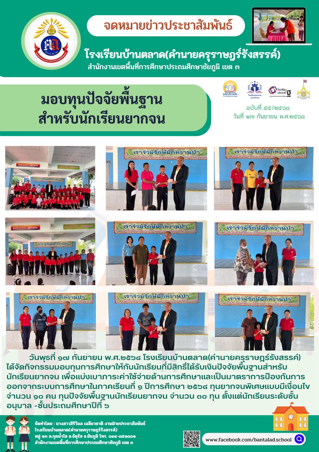 วันพุธที่ ๑๗ กันยายน พ.ศ.๒๕๖๘ โรงเรียนบ้านตลาด(คำนายครุราษฎร์รังสรรค์) ได้จัดกิจกรรมมอบทุนการศึกษาให้กับนักเรียนที่มีสิทธิ์ได้รับเงินปัจจัยพื้นฐานสำหรับนักเรียนยากจน เพื่อแบ่งเบาภาระค่าใช้จ่ายด้านการศึกษาและเป็นมาตราการป้องกันการออกจากระบบการศึกษาในภาคเรียนที่ ๑ ปีการศึกษา ๒๕๖๘ ทุนยากจนพิเศษแบบมีเงื่อนไขจำนวน ๑๐ คน ทุนปัจจัยพื้นฐานนักเรียนยากจน จำนวน ๓๐ ทุน ตั้งแต่นักเรียนระดับชั้บชั้นอนุบาล -ชั้นประถมศึกษาปีที่ 5