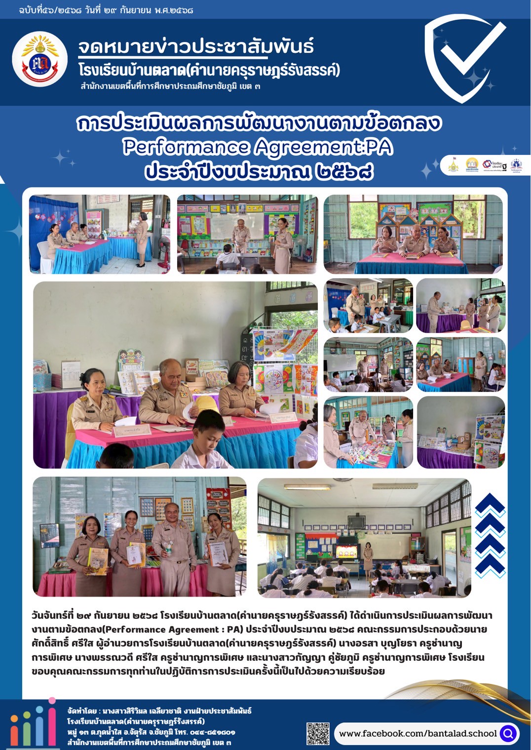 วันจันทร์ที่ ๒๙ กันยายน ๒๕๖๘ โรงเรียนบ้านตลาด(คำนายครุราษฎร์รังสรรค์) ได้ดำเนินการประเมินผลการพัฒนางานตามข้อตกลง(Performance Agreement : PA) ประจำปีงบประมาณ ๒๕๖๘ คณะกรรมการประกอบด้วยนายศักดิ์สิทธิ์ ศรีใส ผู้อำนวยการโรงเรียนบ้านตลาด(คำนายครุราษฎร์รังสรรค์) นางอรสา บุญโยธา ครูชำนาญการพิเศษ นางพรรณวดี ศรีใส ครูชำนาญการพิเศษ และนางสาวกัญญา คู่ชัยภูมิ ครูชำนาญการพิเศษ โรงเรียนขอบคุณคณะกรรมการทุกท่านในปฏิบัติการการประเมินครั้งนี้เป็นไปด้วยความเรียบร้อย