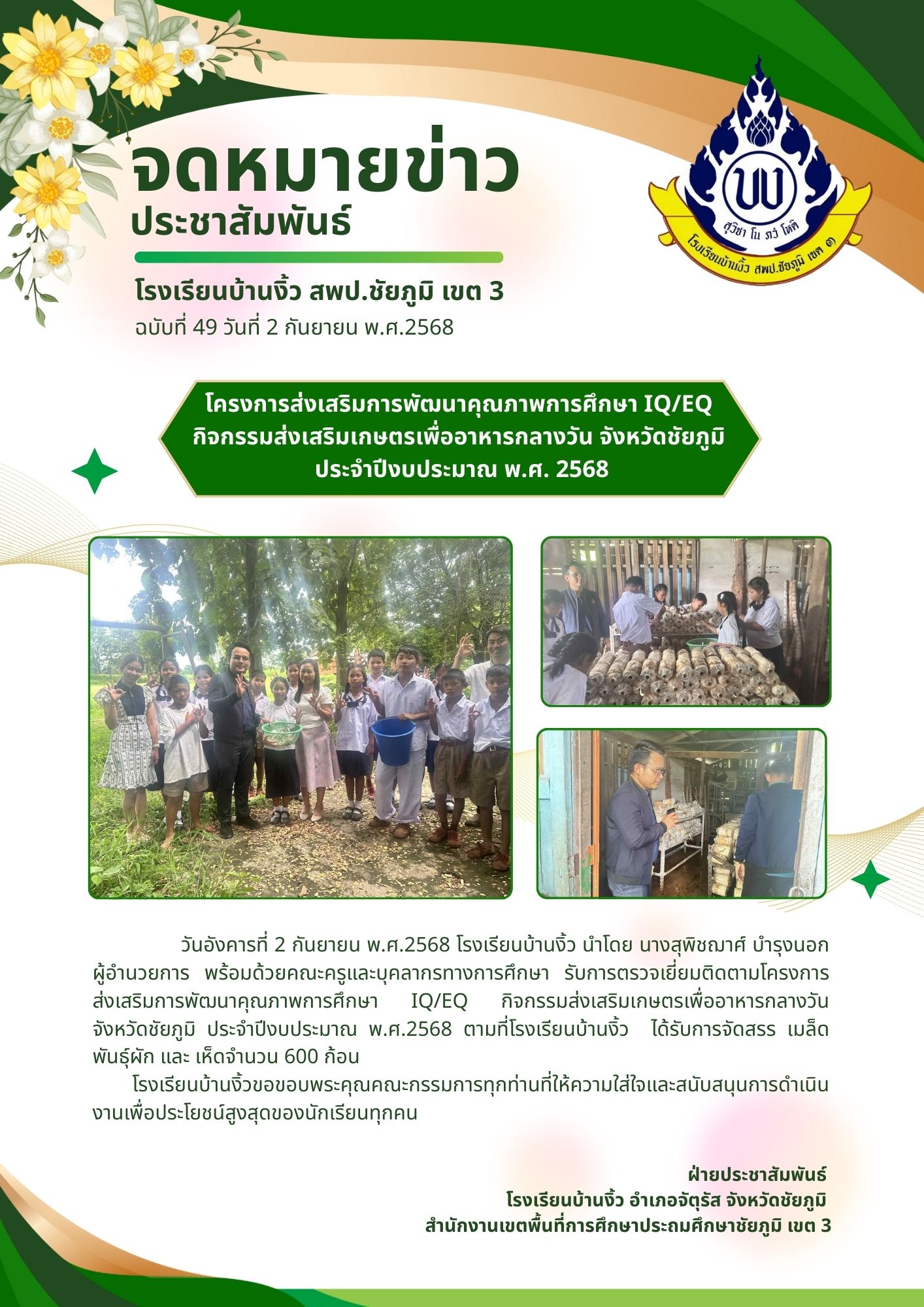 2 | วันอังคารที่ 2 กันยายน พ.ศ.2568 โรงเรียนบ้านงิ้ว นำโดย นางสุพิชฌาศ์ บำรุงนอก ผู้อำนวยการ พร้อมด้วยคณะครูและบุคลากรทางการศึกษา รับการตรวจเยี่ยมติดตามโครงการส่งเสริมการพัฒนาคุณภาพการศึกษา IQ/EQ กิจกรรมส่งเสริมเกษตรเพื่ออาหารกลางวัน จังหวัดชัยภูมิ ประจำปีงบประมาณ พ.ศ.2568 ตามที่โรงเรียนบ้านงิ้ว ได้รับการจัดสรร เมล็ดพันธุ์ผัก และ เห็ดจำนวน 600 ก้อน